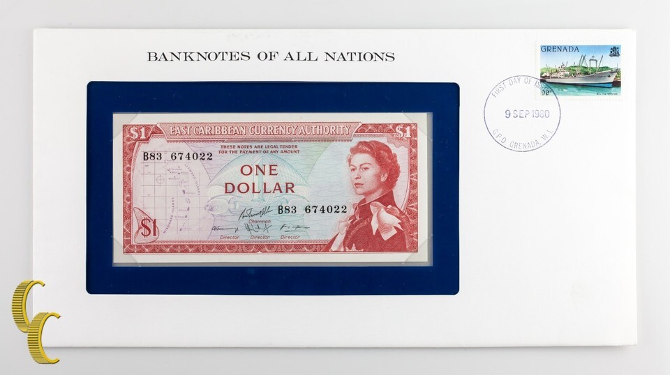1980 East Caribbean One Dollar $1 in Banknotes of All Nations Stamped Envelope