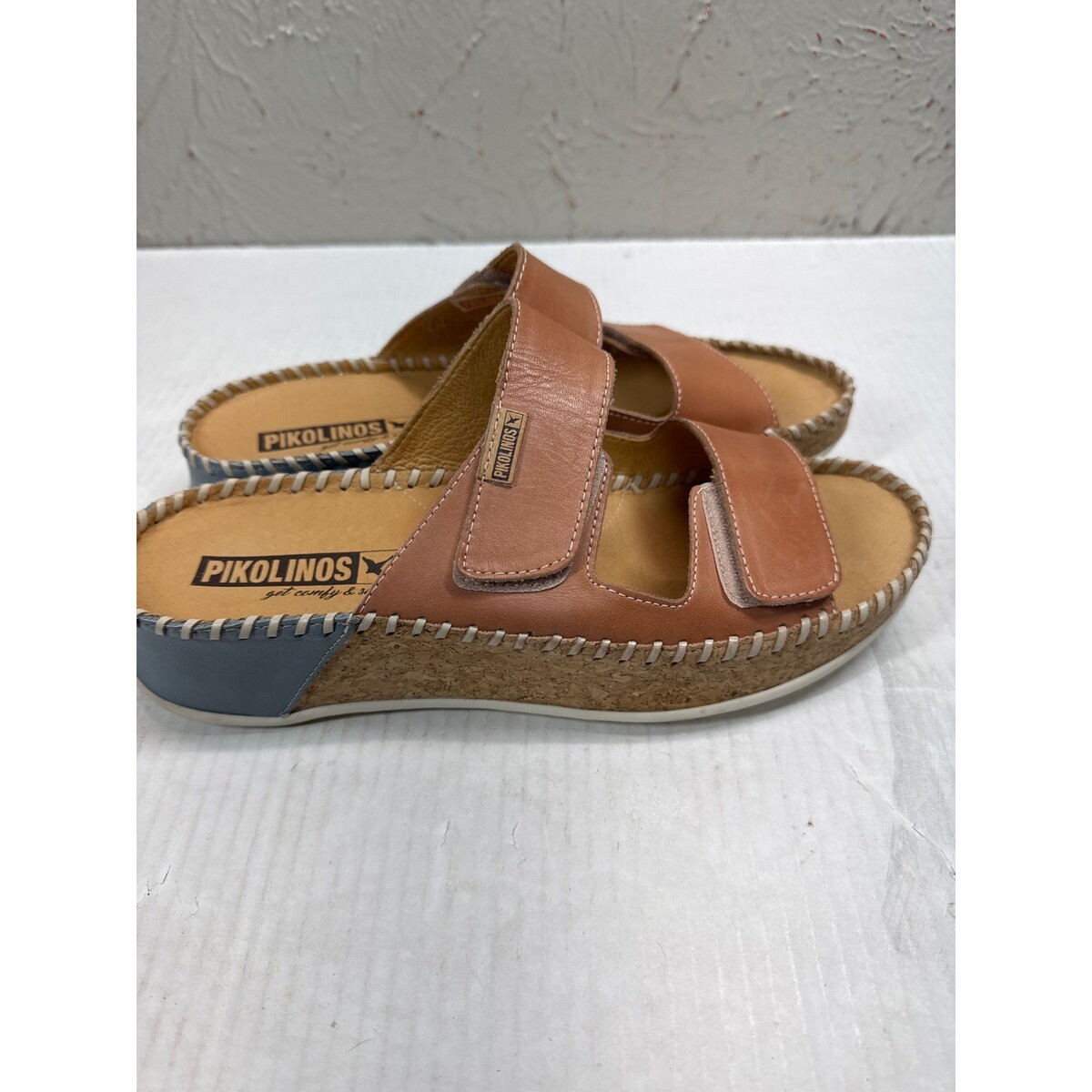 Keywords: Pikolinos sandals, women's slides, leather sandals, adjustable strap, comfort footwear, casual sandals, European design, slip on shoes, summer footwear, orthotic friendly, artisanal, tan sandals