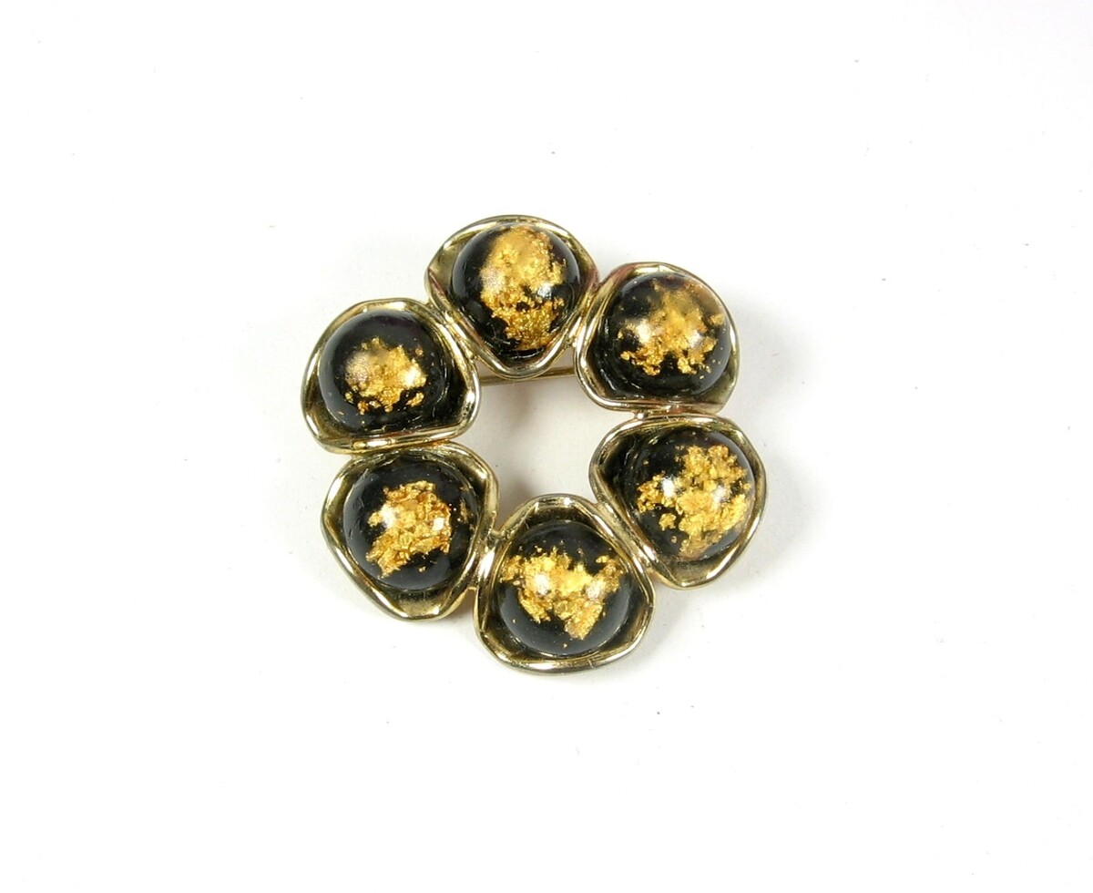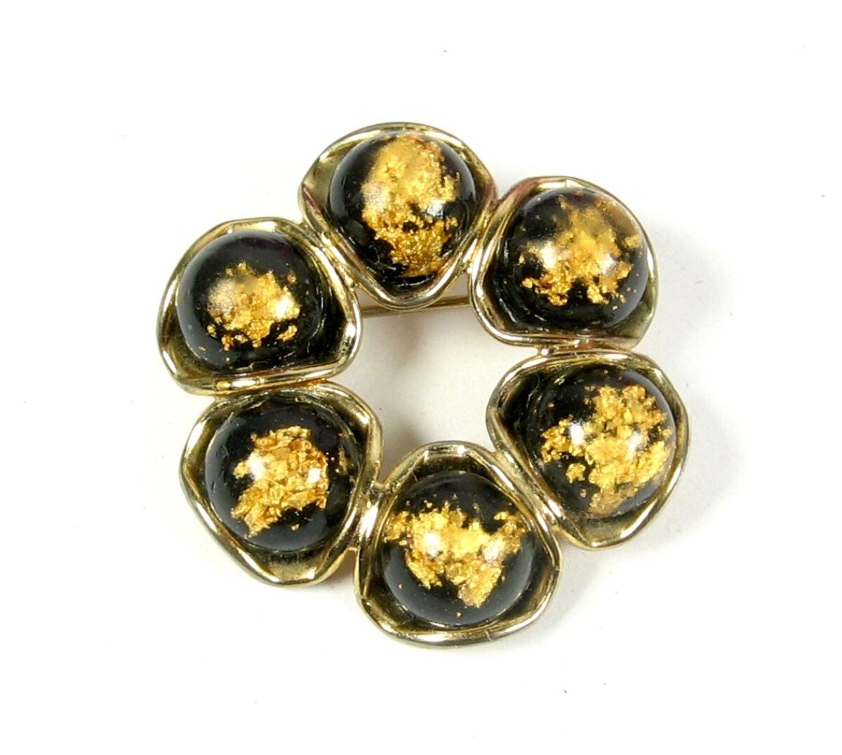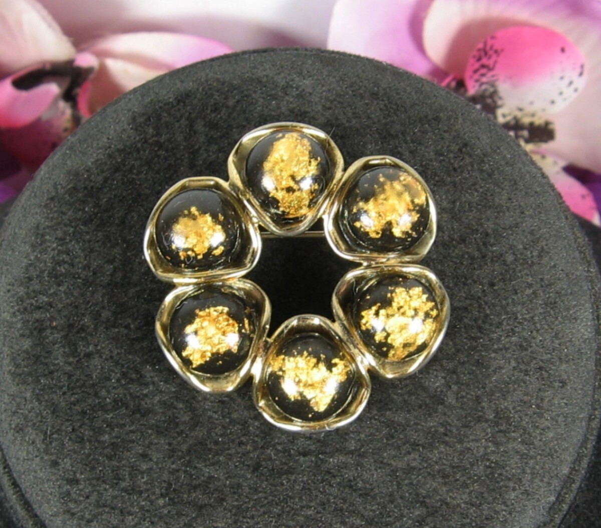 Vintage Lucite Brooch ? Gold Flake Confetti in Black Cabochons ? Mid-Century Glam