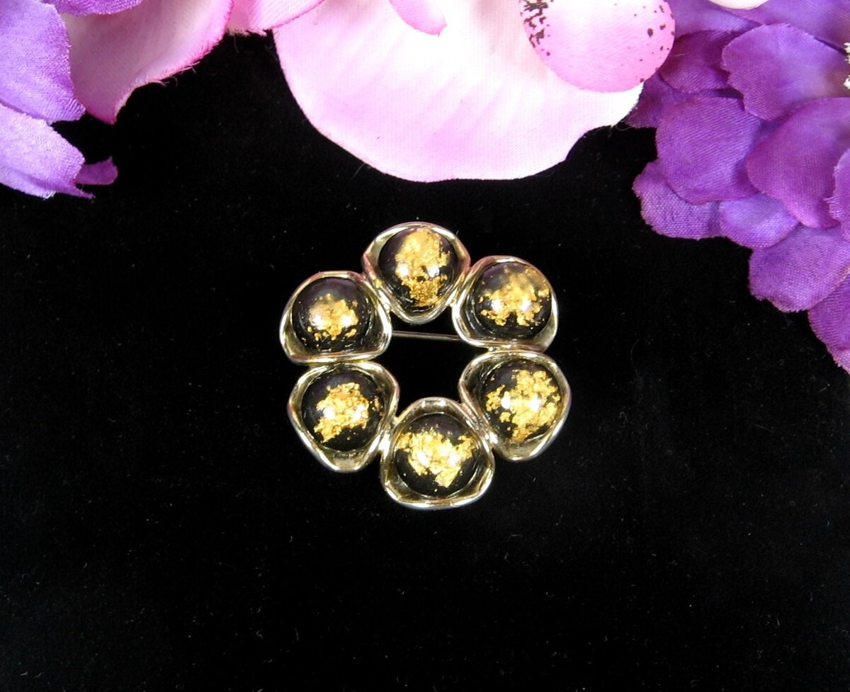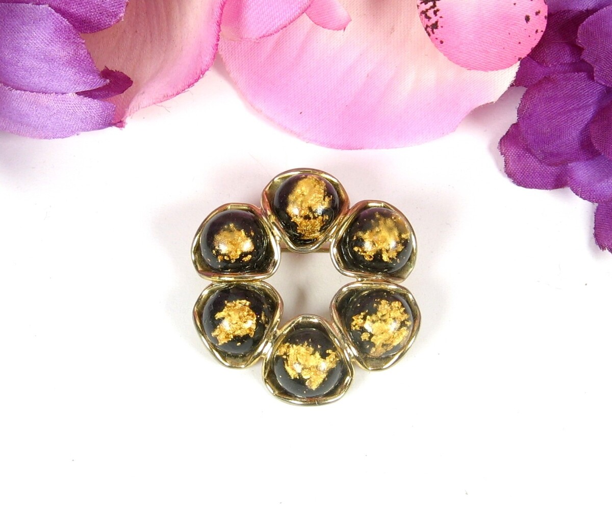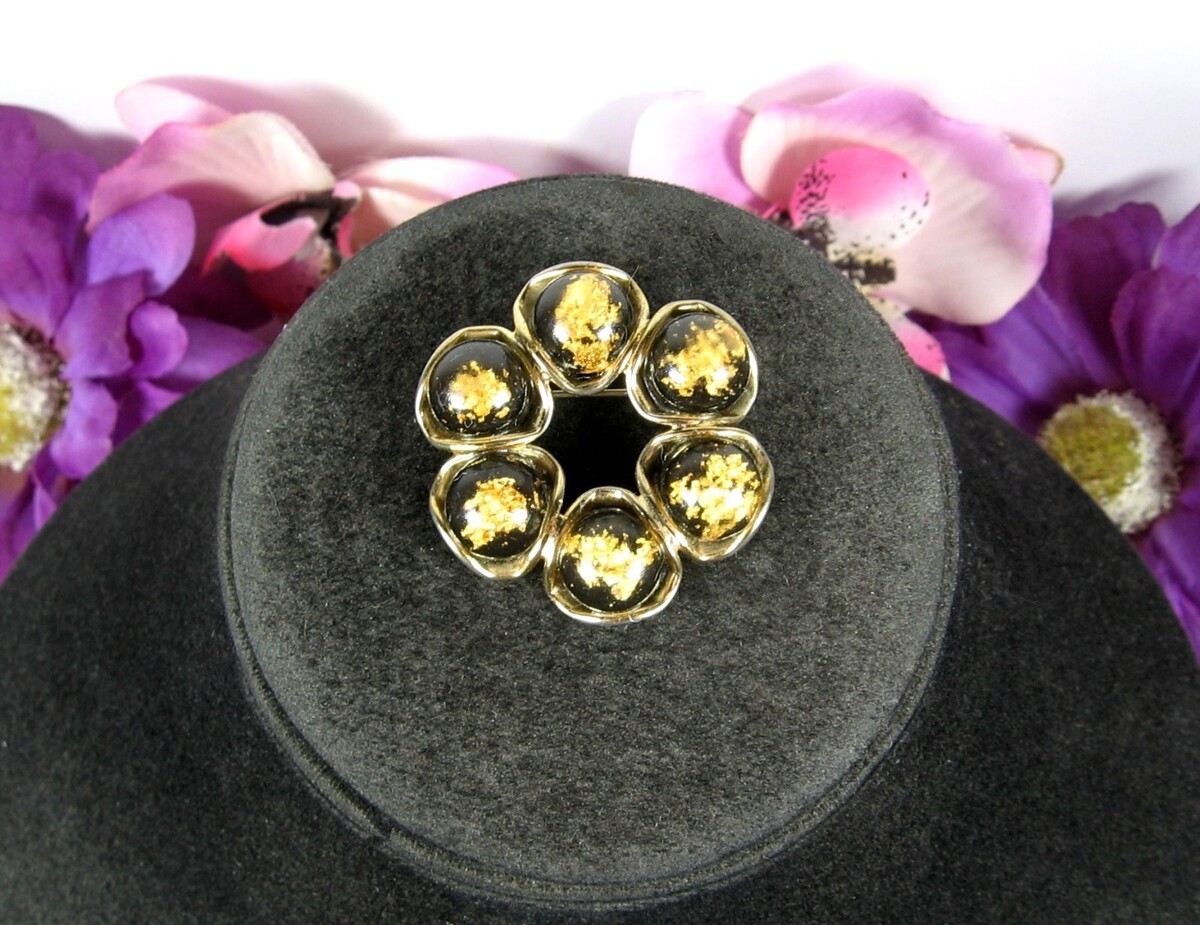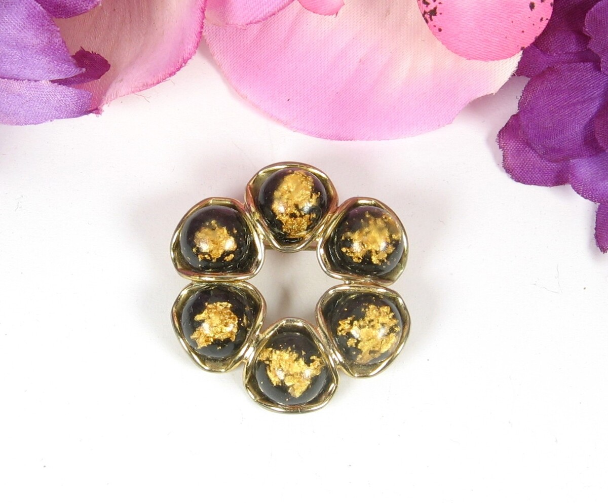 Vintage GOLD FLAKE CONFETTI Lucite BROOCH Black Cabochons MCM Pin Goldtone 1.5"