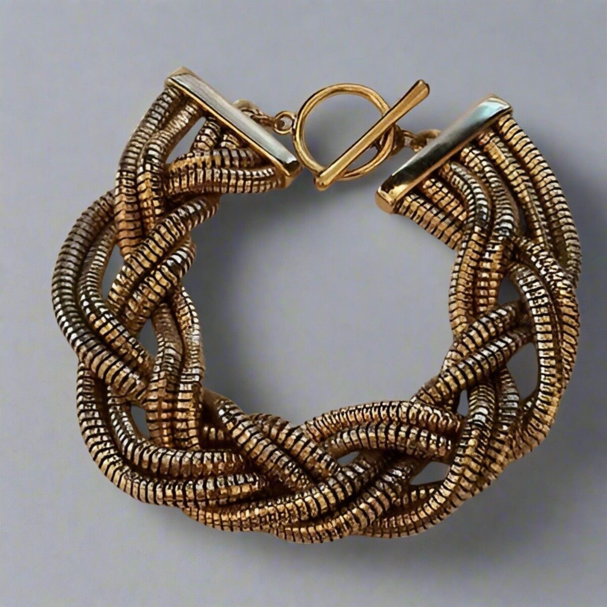 Elegant vintage style gold-tone braided chain bracelet featuring a beautifully woven multi-strand design that creates a bold, textured look. The rich gold finish gives this bracelet a timeless and luxurious appeal, perfect for adding a touch of sophistication to any outfit.