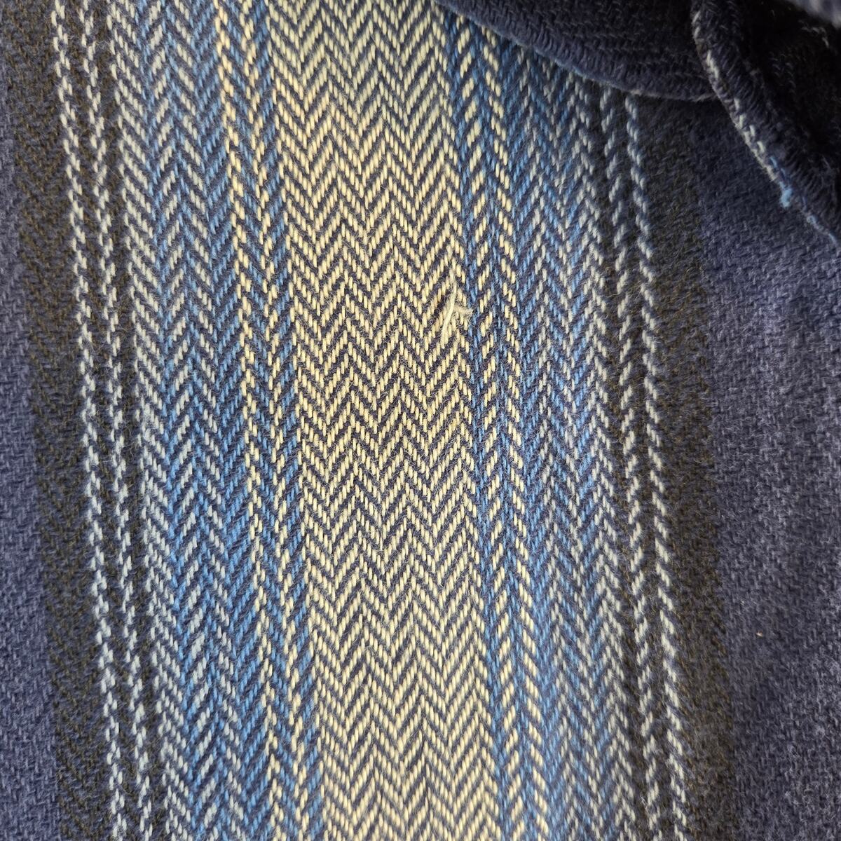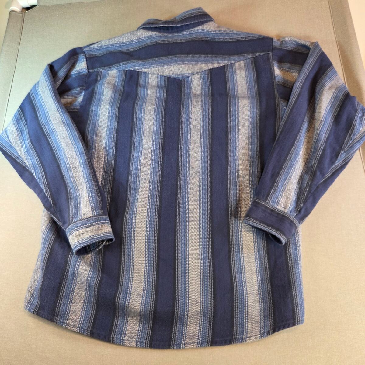This Dakota Tallman men?s western shirt features a bold striped pattern in shades of blue with pearl snap buttons and double chest pockets. Made in a classic cowboy style, this shirt blends rugged charm with everyday wearability. Shows a couple of loose threads as pictured but still in solid wearable condition.