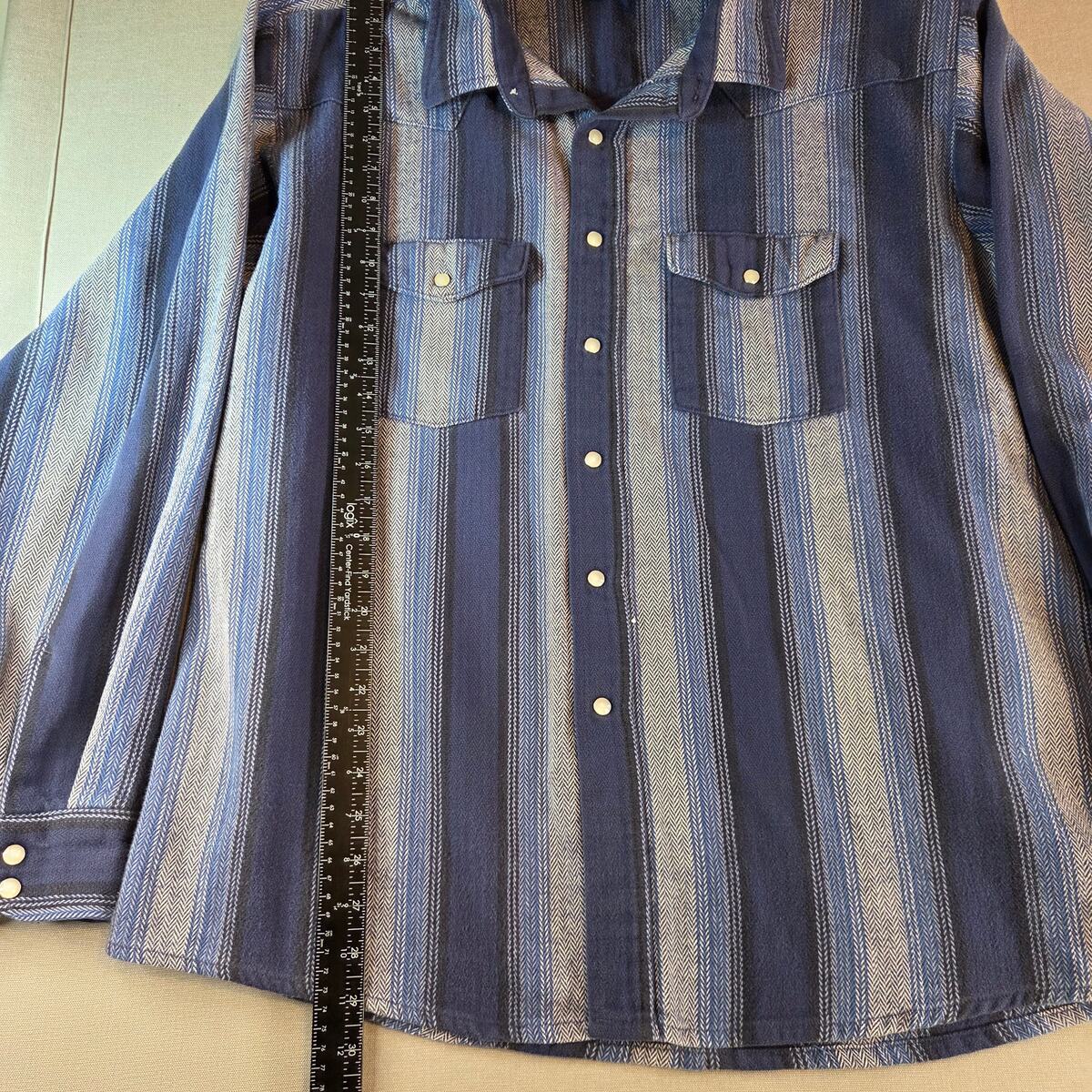Details: Pearl snap buttons, striped pattern, two chest pockets