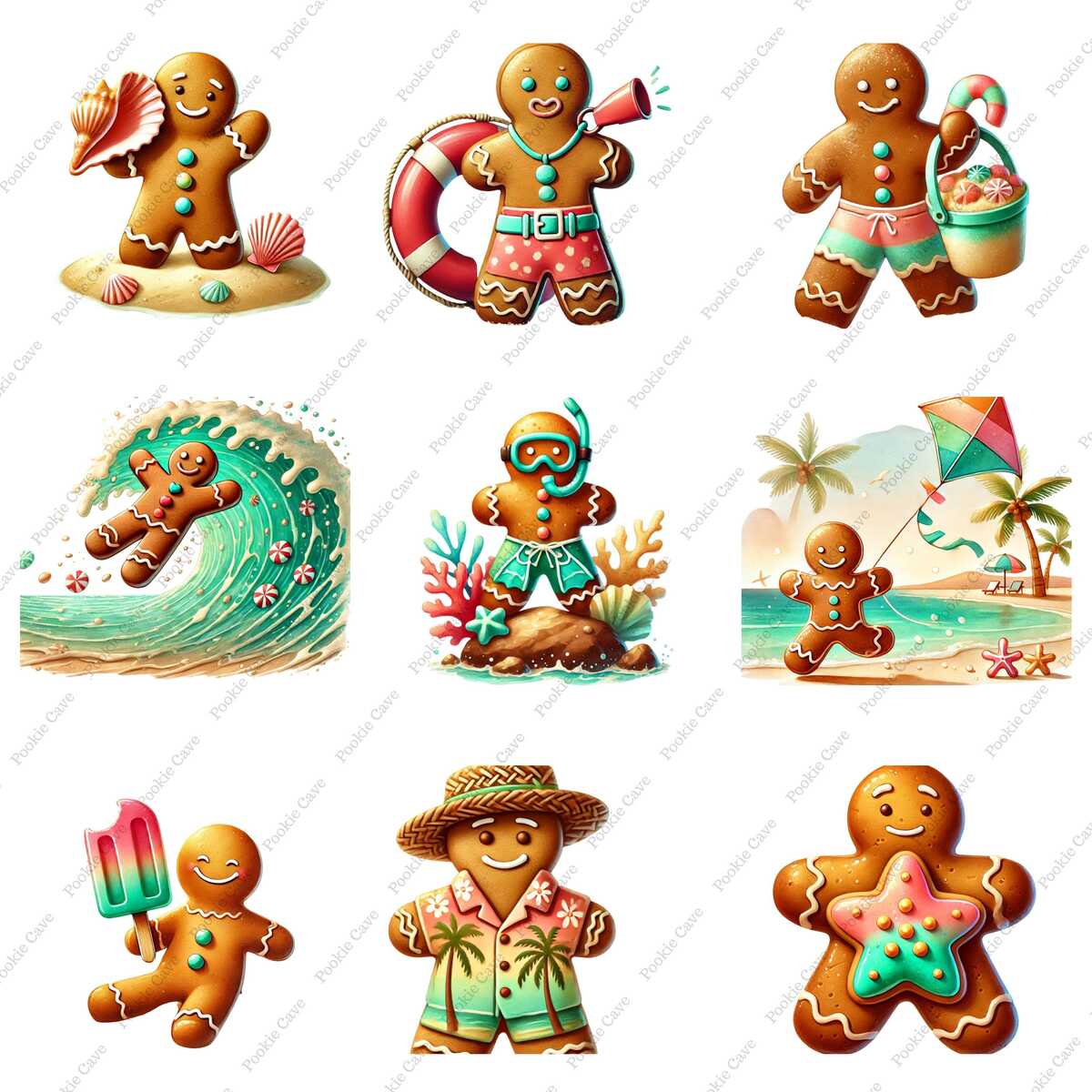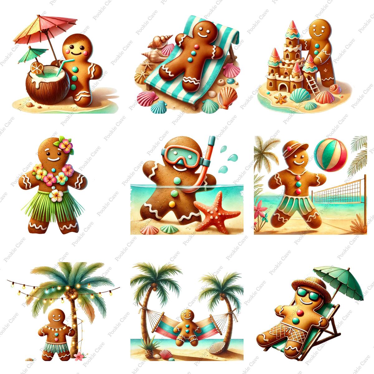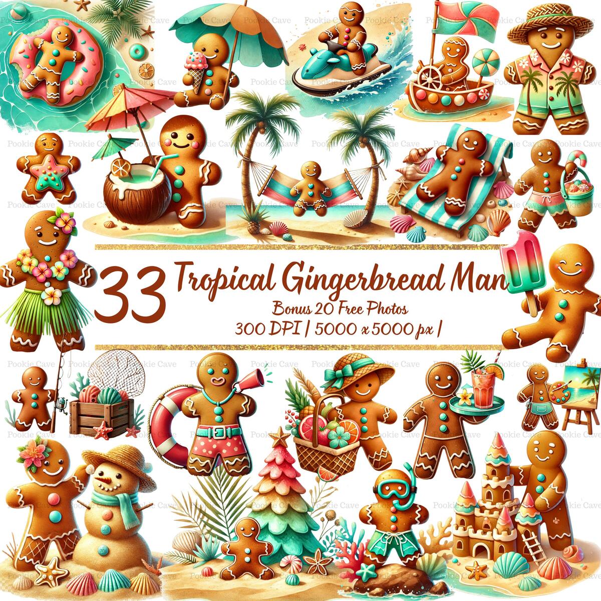 Bring a sun-soaked twist to your holiday designs with this 33 Tropical Gingerbread Man Clipart Set! Perfect for crafters, designers, and small businesses looking to stand out with a beachy Christmas aesthetic.