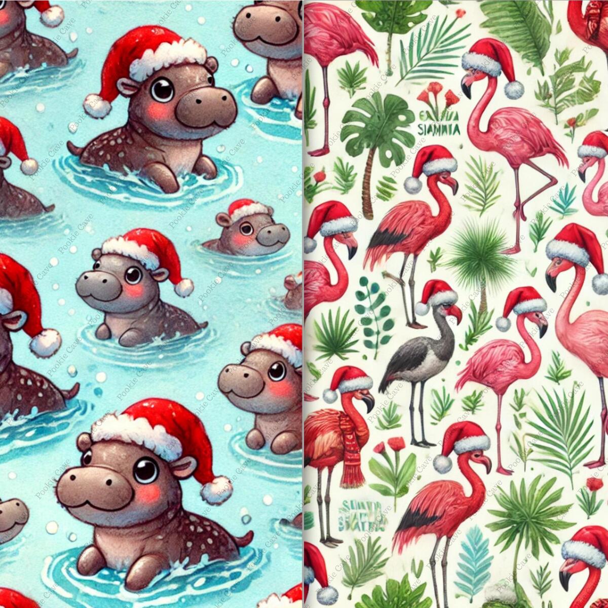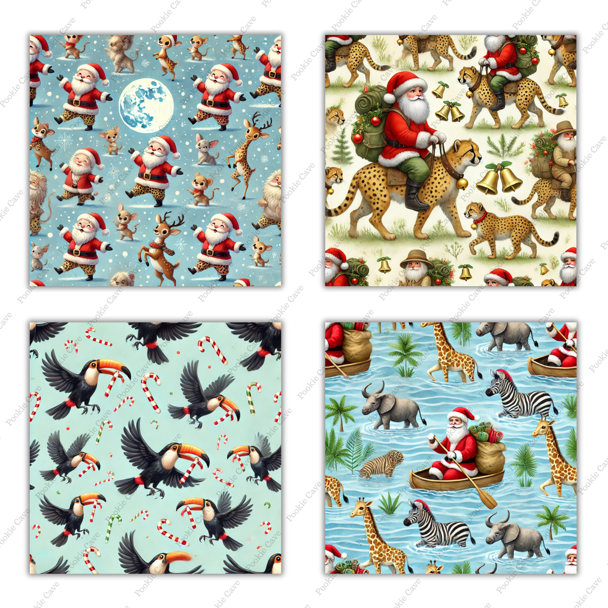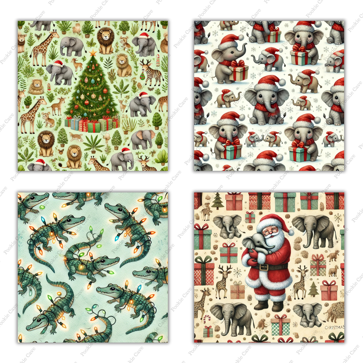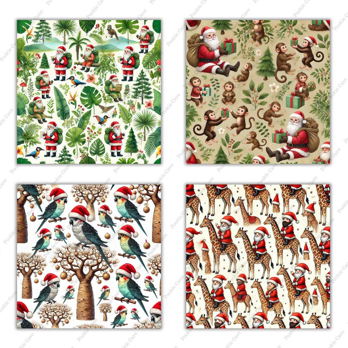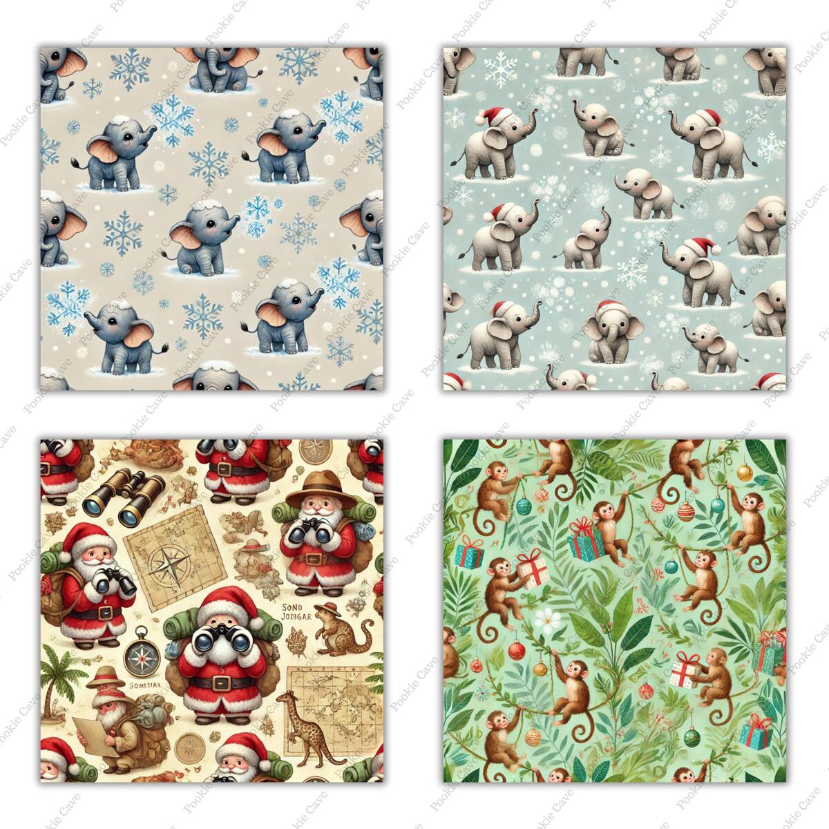 Bring festive cheer to the wild with this Animal Safari Christmas Digital Paper Bundle! This unique collection features tiny patterns of Santa Claus riding giraffes, elephants in Santa hats, zebras wrapped in fairy lights, and more — all in a lush tropical safari theme. Perfect for adding exotic flair to your holiday designs!