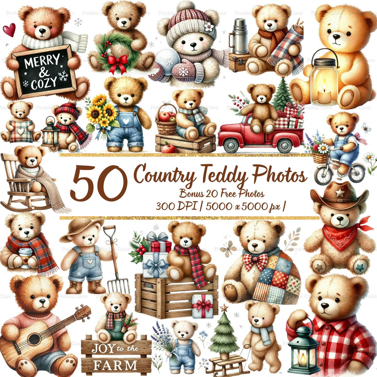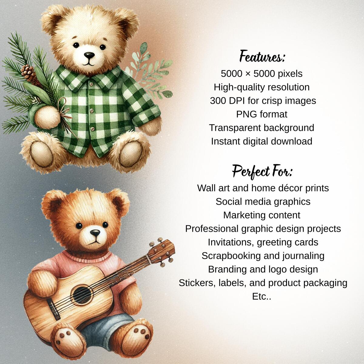 Bring the heart of the countryside to your creative projects with this Country Teddy Bear Watercolor Clipart Bundle — a charming collection of rustic, cozy teddy bears in watercolor style.