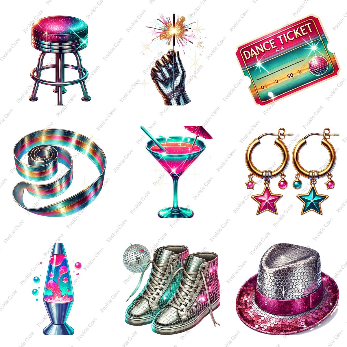 This 39-piece Retro New Year Clipart Collection is inspired by the vibrant style of the 1970s disco era — featuring neon sparkles, mirrored textures, and glittery glam!