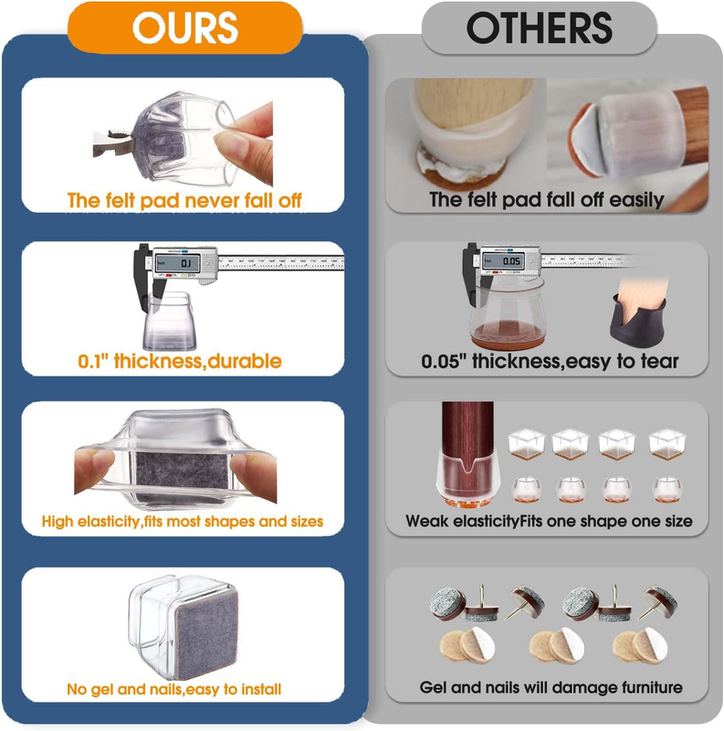 UPGRADE ENHANCED VERSION: Our upgraded square floor protectors for hardwood floors the felt pads and the silicone into one inseparable piece. The upgraded detail treatment can ensure that the bottom felt will never fall off! The enhanced thickness of silicone can better protect your chair legs and floor.
