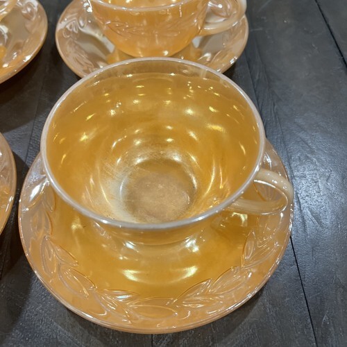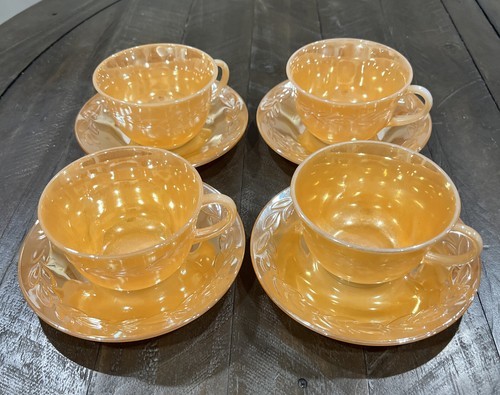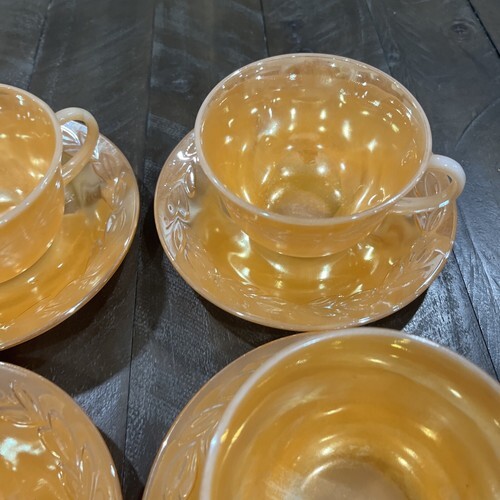 Add a touch of vintage charm to your tea time with this beautiful set of 4 tea cups and saucers from Anchor Hocking's Fire-King product line. The elegant peach luster color and delicate leaves pattern make this set a must-have for any collector or lover of unique decor.