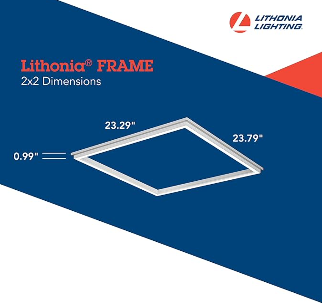 SPECIFICATIONS: The Frame LED Lay-in Ceiling Light has dimensions of 23.8 in. x 23.8 in. x .99 in.; MVOLT 120-277 VAC; 5-year limited warranty; 0-10 volts driver dims down to 10 percent with compatible dimmers; 80% LED lumen maintenance at 60,000 hours