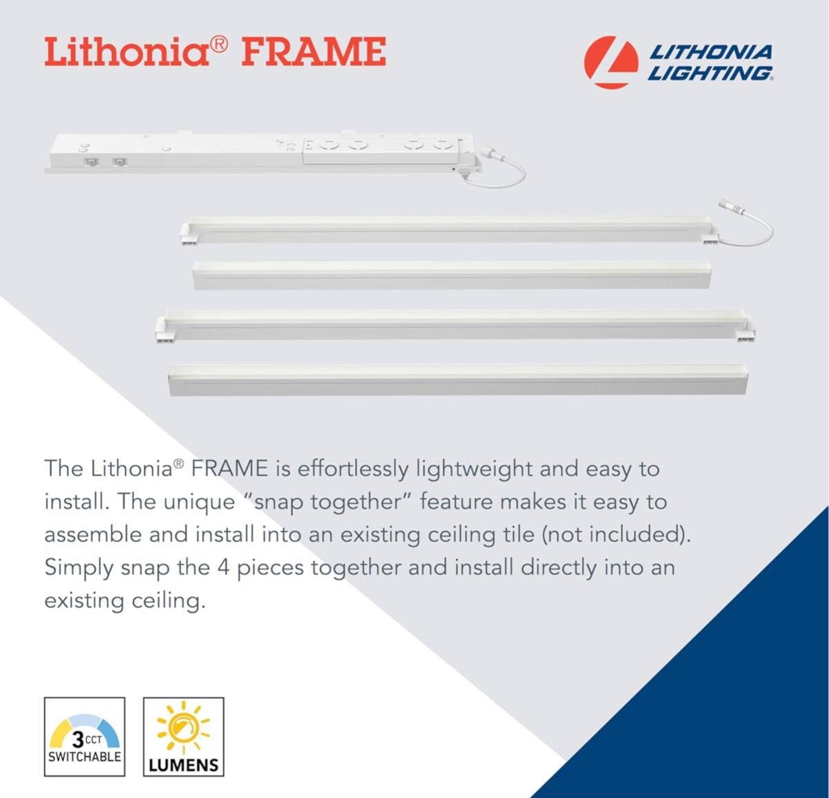 The FRAME LED Lay-in ceiling light combines sleek, modern design with advanced lighting technology to deliver exceptional performance and style. Simple and Stylish, the FRAME is perfect for commercial office, healthcare, retail, and educational applications. Engineered with cutting-edge optical technology, the FRAME provides the same brightness and energy efficiency as traditional LED flat panels, but at a fraction of the weight and cost. Its customizable features, including switchable color temperatures (3500K, 4000K, and 5000K) and adjustable lumen output (3000LM, 4000LM, and 5000LM), allow you to fine-tune the light to suit any space. Ideal for distributors and installers, its compact packaging saves storage space, while switchable lumens accommodate varying ceiling heights. The "snap-together" design ensures simple installation into standard 15/16-inch and narrow 9/16-inch T-grid systems?no cutting required. Built for durability, it features long-life LEDs, a high-efficiency driver, and is certified for damp locations. With dimensions of 23.8" x 23.8" x 0.99", it operates on MVOLT 120-277 VAC, supports 0-10V dimming down to 10%, and offers 80% lumen maintenance at 60,000 hours. With CSA, IC, and DLC Premium certifications, damp location certification, The FRAME is the ultimate in customizable, reliable, and efficient lighting.