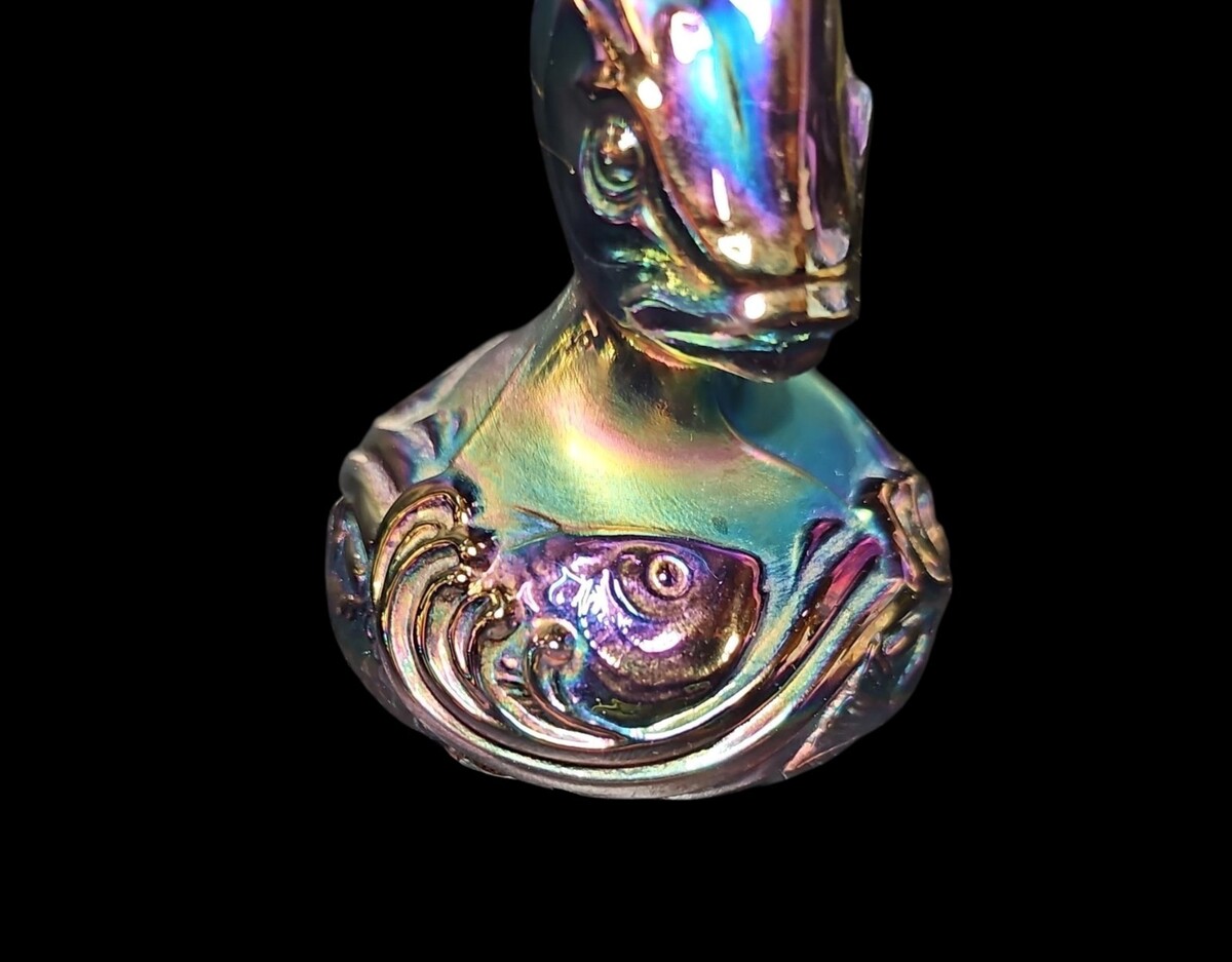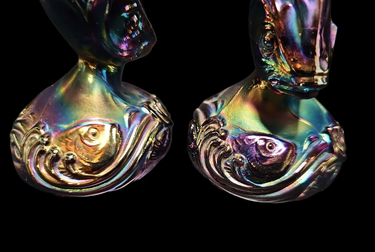 These pieces were made by Fenton Art Glass and are sometimes referred to as ?jumping trout? or ?koi fish? figures. Each one measures approximately 6 inches tall and displays classic Fenton craftsmanship with rich luster and strong mold definition.