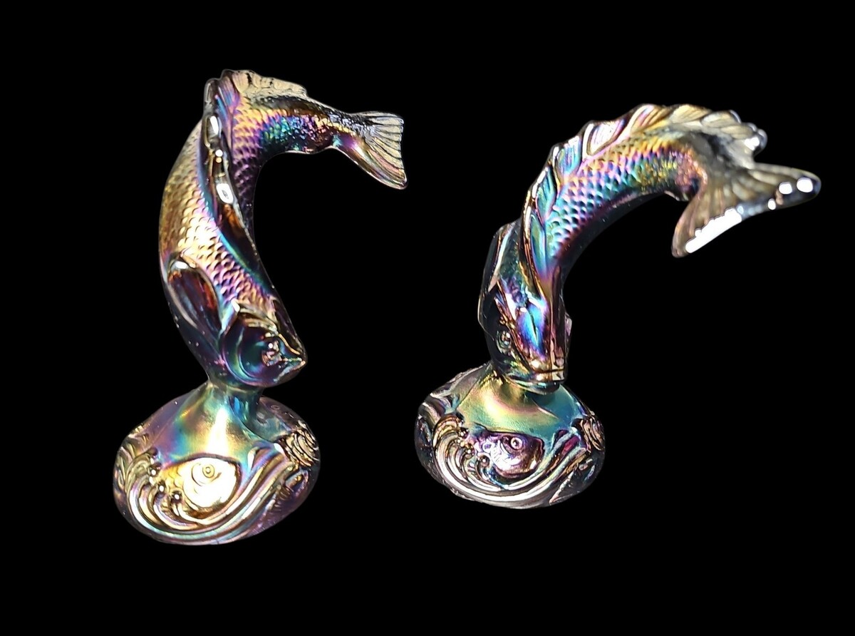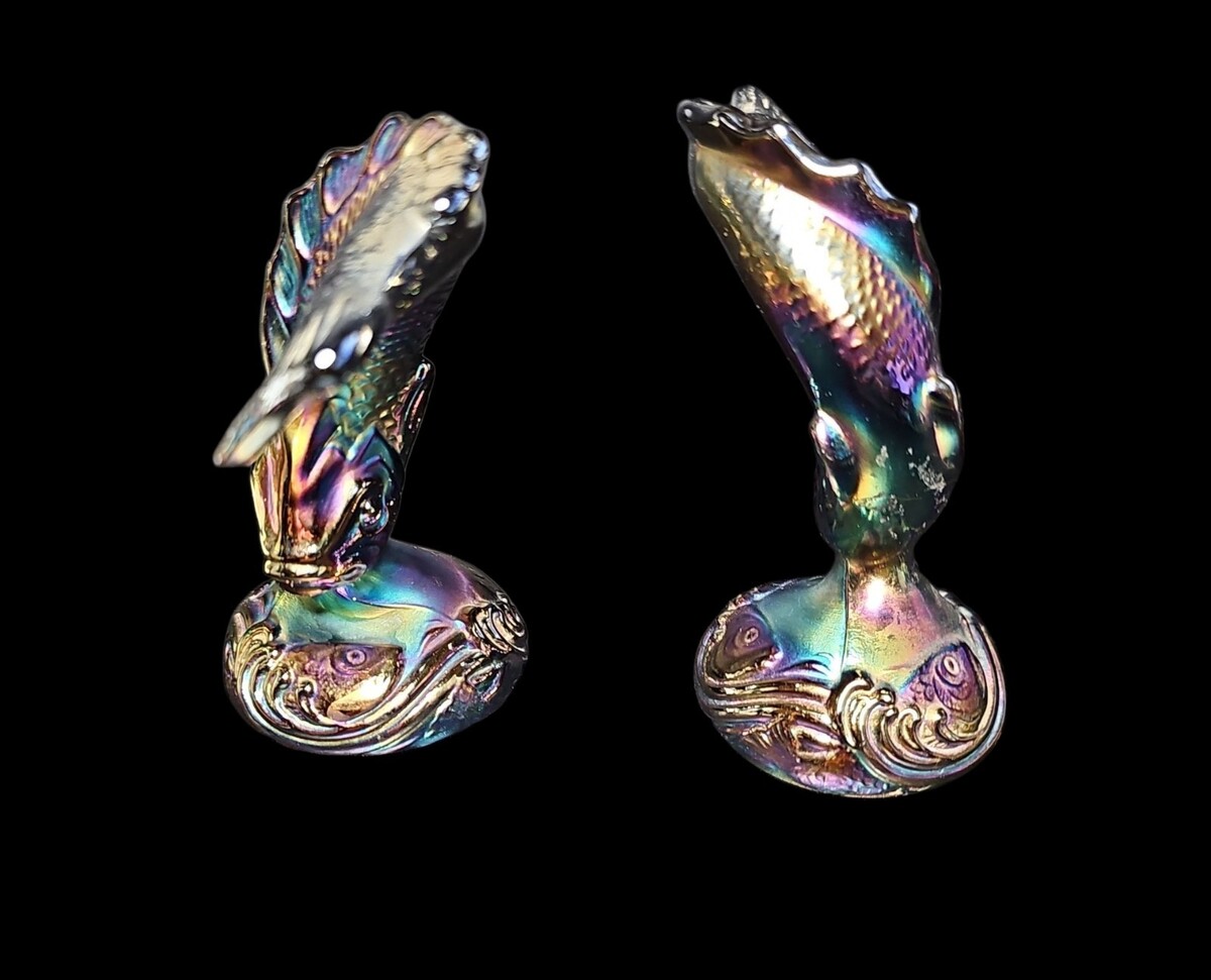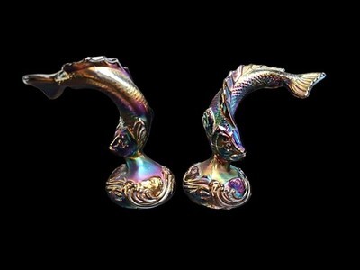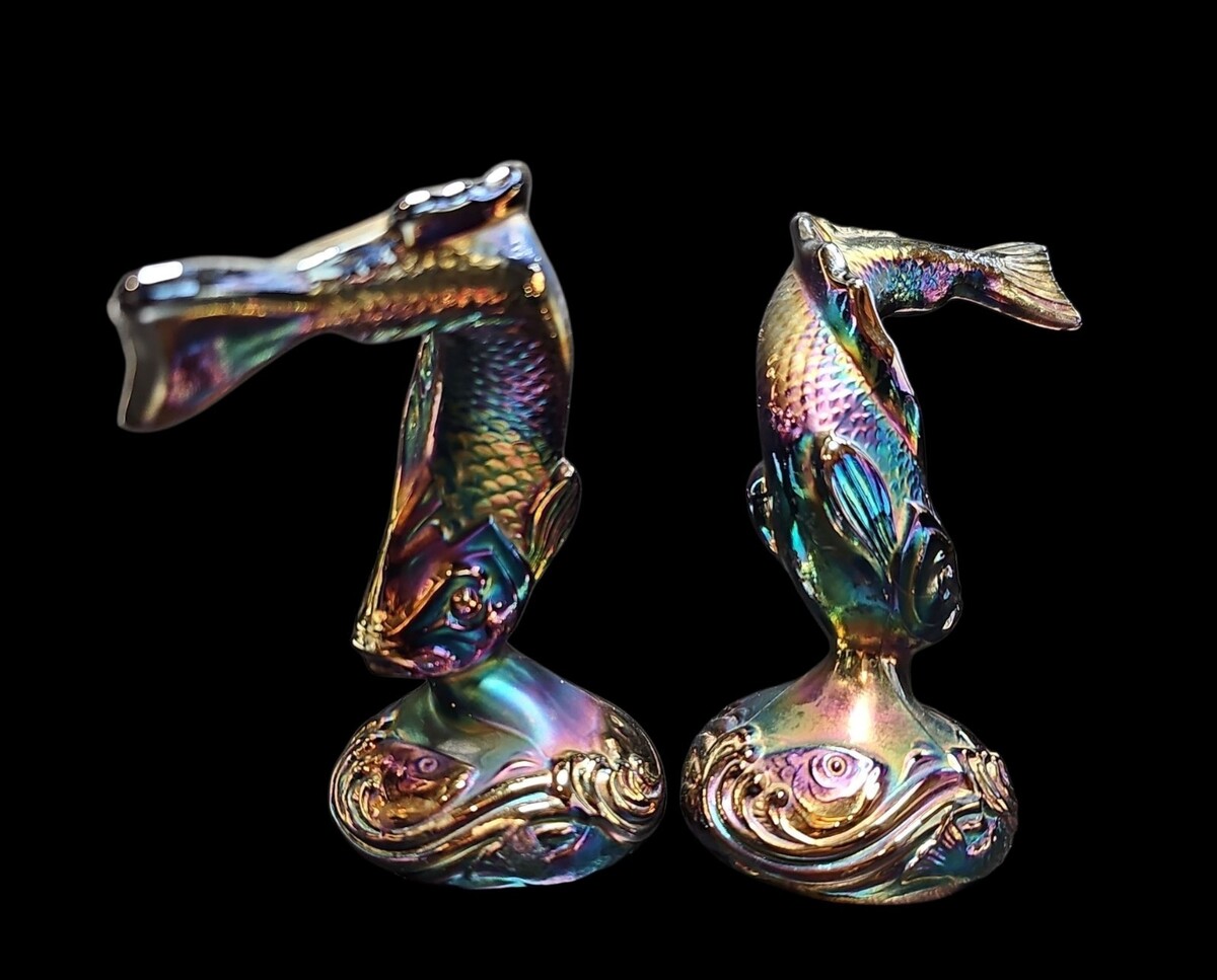 These pieces were made by Fenton Art Glass and are sometimes referred to as ?jumping trout? or ?koi fish? figures. Each one measures approximately 6 inches tall and displays classic Fenton craftsmanship with rich luster and strong mold definition.