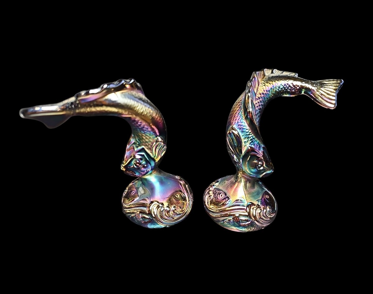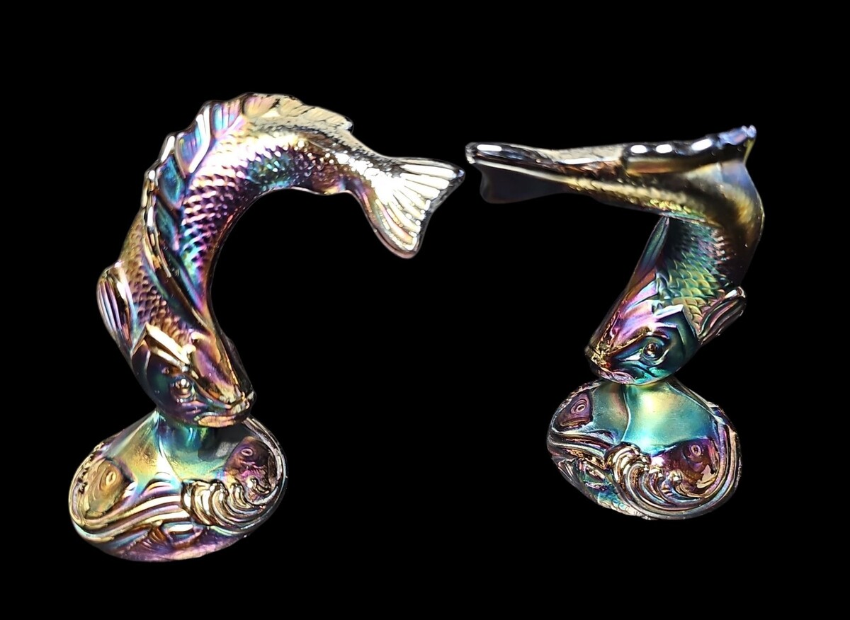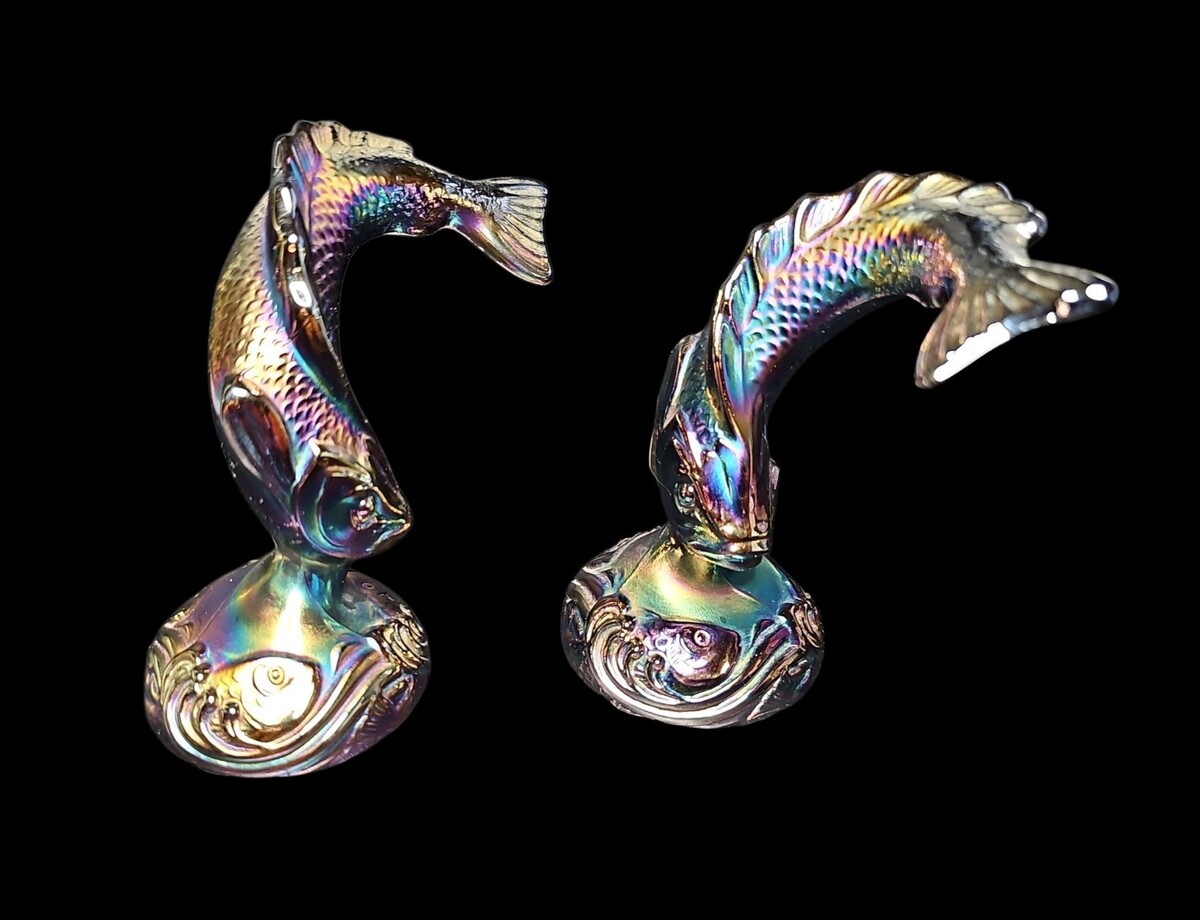 These pieces were made by Fenton Art Glass and are sometimes referred to as ?jumping trout? or ?koi fish? figures. Each one measures approximately 6 inches tall and displays classic Fenton craftsmanship with rich luster and strong mold definition.