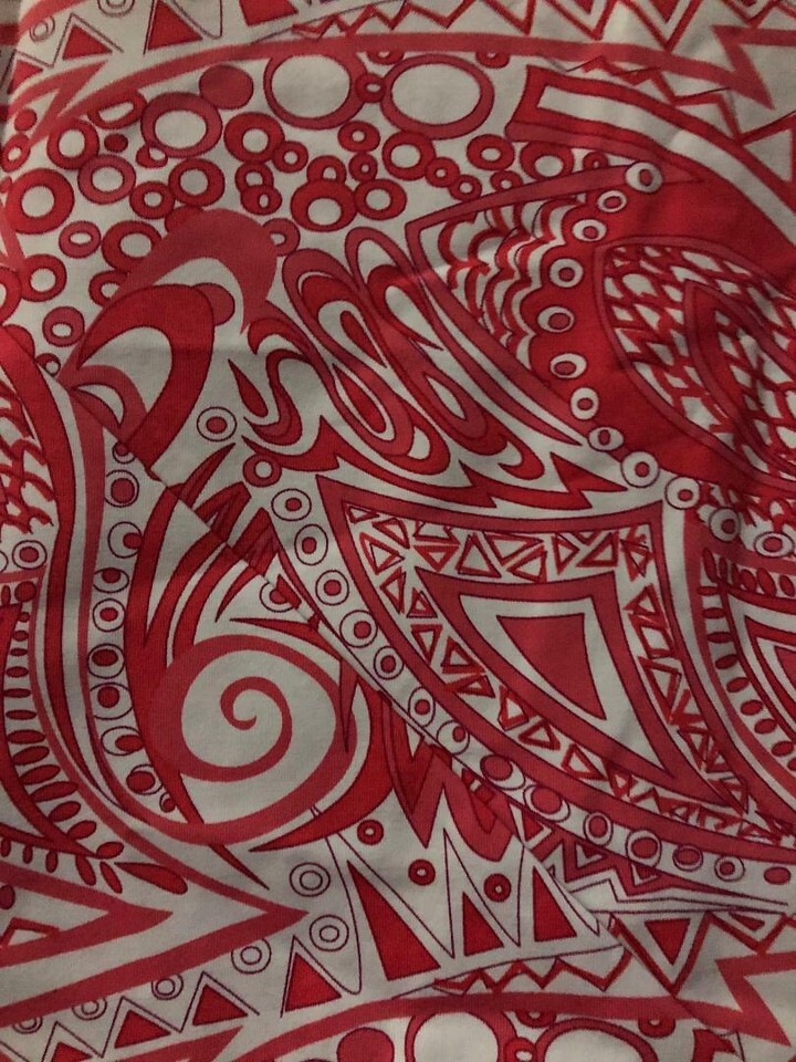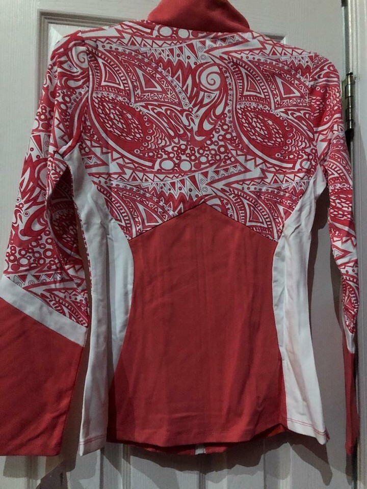 This is a knit stretch jacket that zips up the front. There are 3 front pockets. The fabric is a Polyester Spandex Blend that is a little thicker than their shirts with some stretch. The colors are Shades of Coral White.