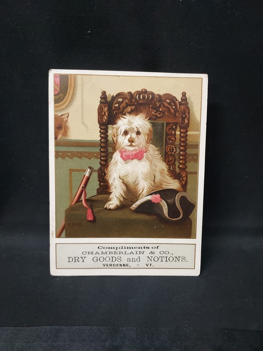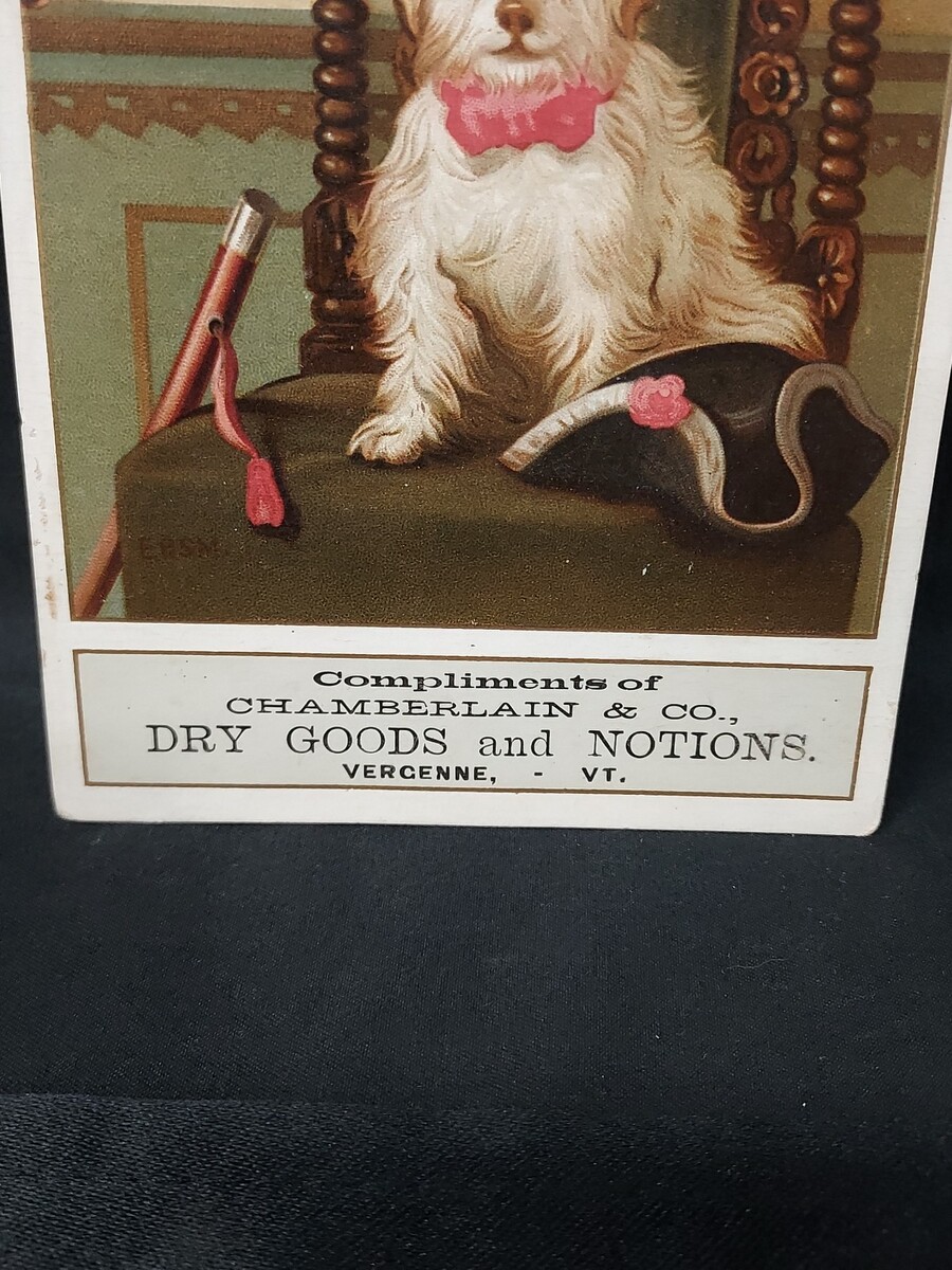 Victorian Trade Card Chamberlain & Co. Dry Goods Vergennes Vermont, Dog On Chair