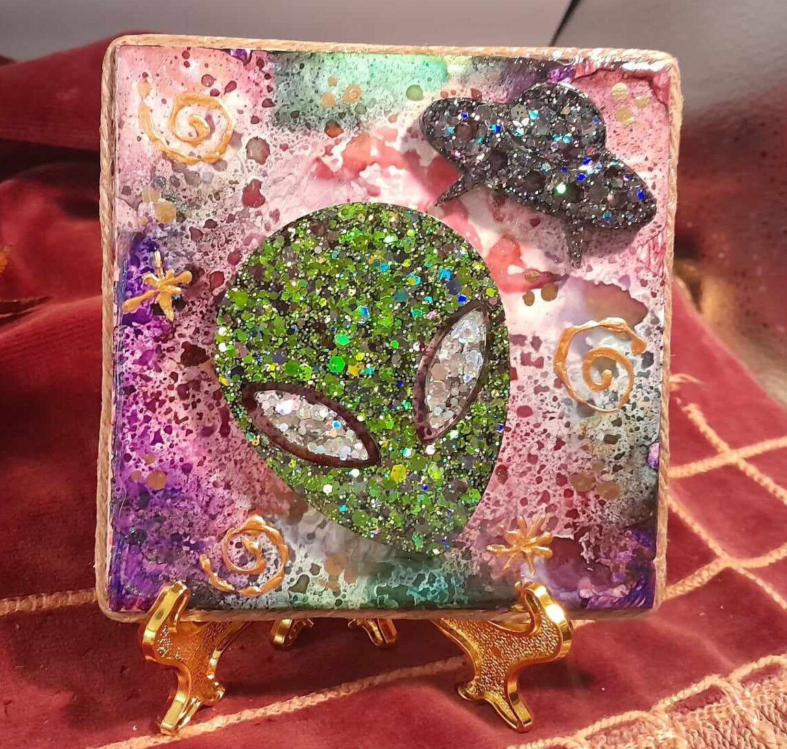 Alient Invasion UFO Handcrafted Mixed Media Ceramic Tile Decor Small Spaces Wall