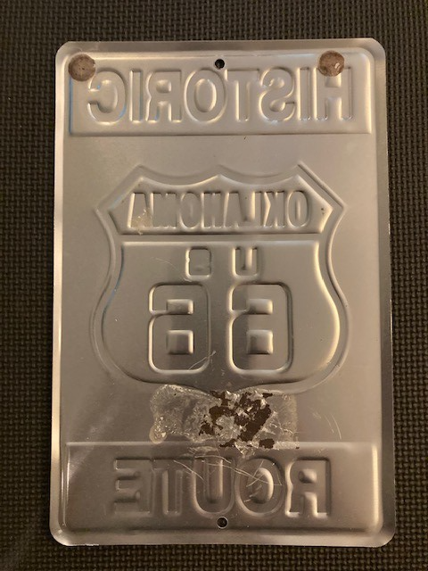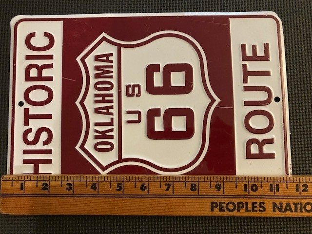 Historic Route 66 Oklahoma 12" x 8" Stamped Reproduction Metal Sign Decoration Some scuffs and scratches. Some residue on the back as shown. Please refer to images.