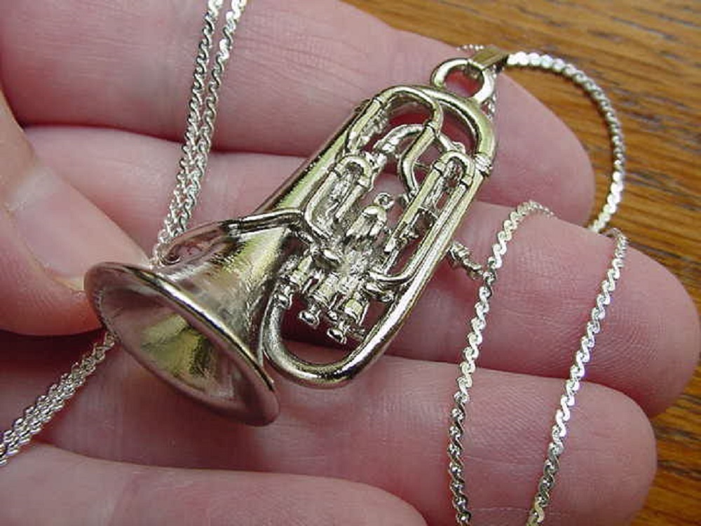 JEWELRY ONLY - NOT A REAL INSTRUMENT! Miniature (2") replica of a Besson 4 Valve Compensating "Sovereign", the professional standard. Every intricate tubular bend has been meticulously replicated in this fully three-dimensional (pewter with Nickel-silver plated (non-tarnish)) pendant, it includes a 18" silver tone NECKLACE CHAIN. This is a LICENSED item by the manufacturers of the real instruments. DETAIL CANNOT BE FAULTED, EVEN BY PROFESSIONALS! Quality is tops. Necklace for guy or gal.
