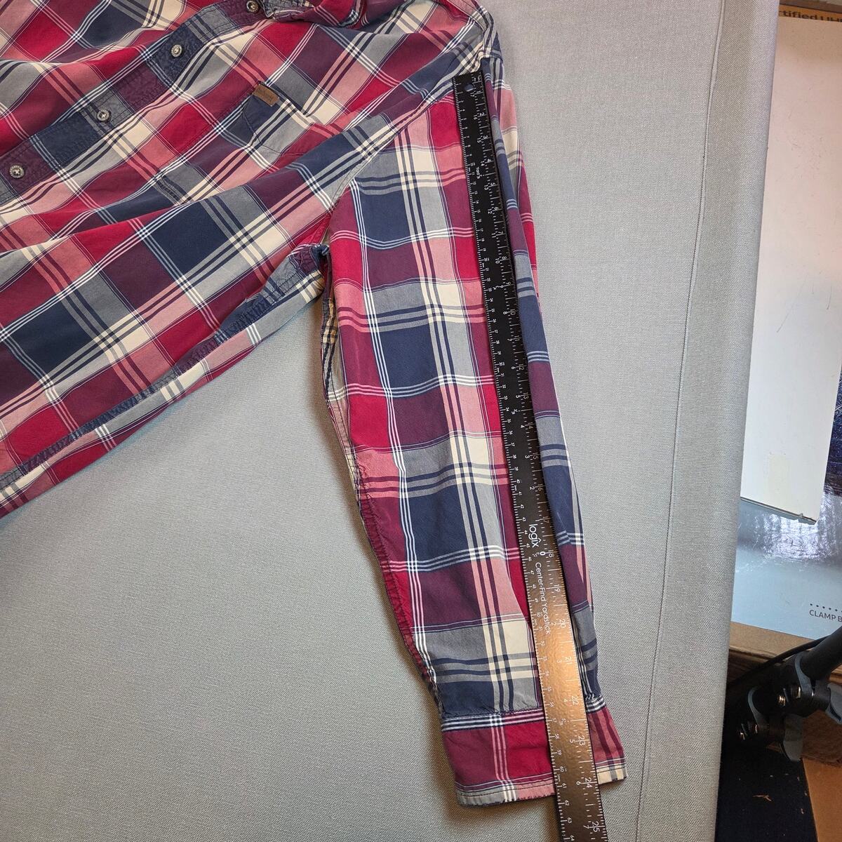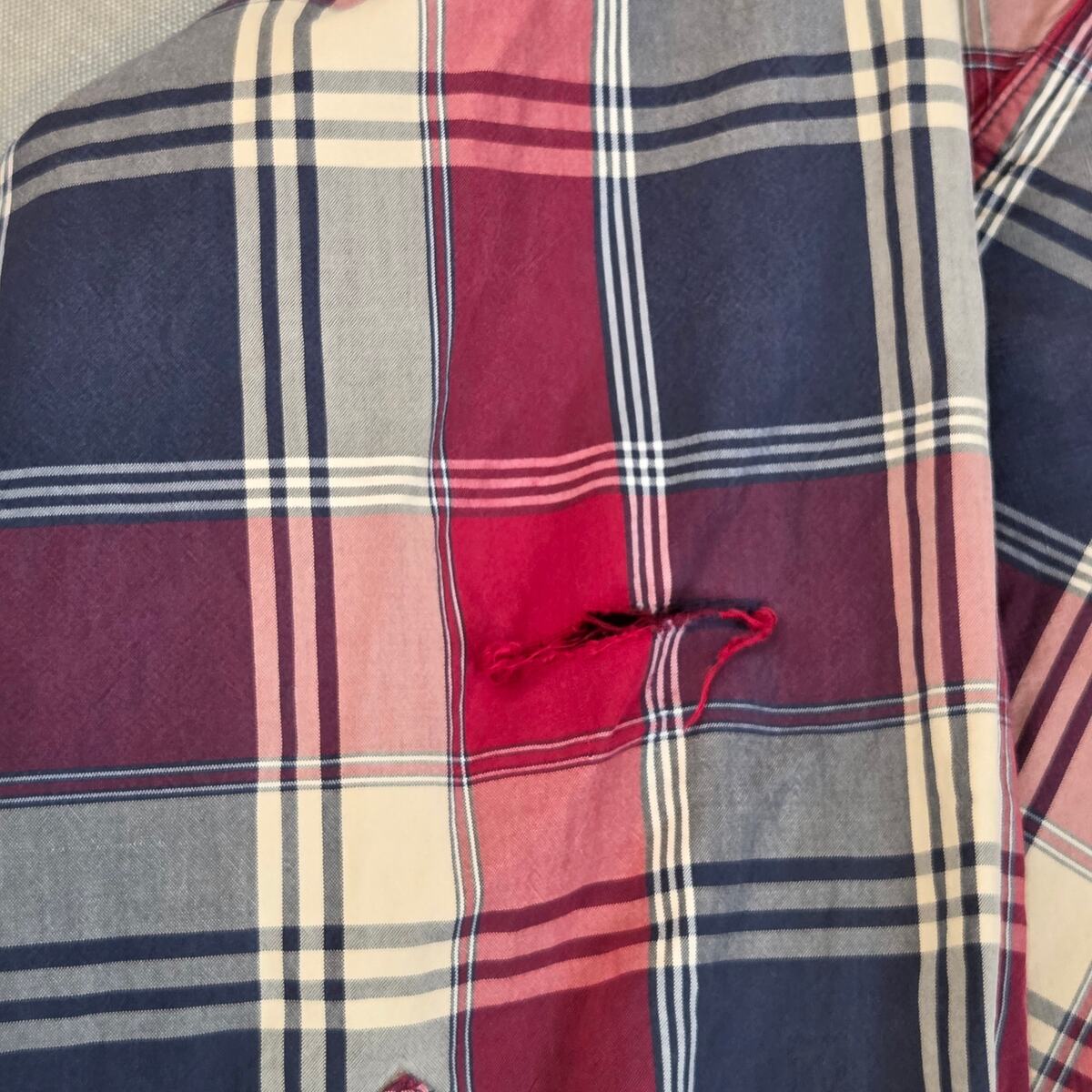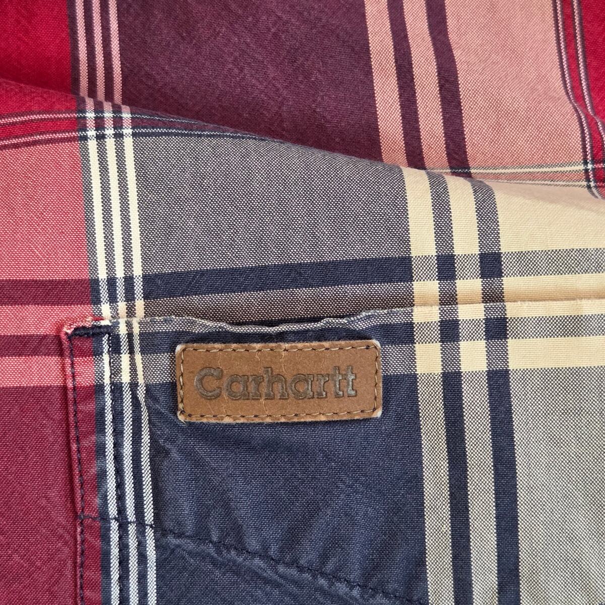 Carhartt 100% cotton plaid shirt in red, navy, and cream tones. Long sleeve, button front, and chest pocket with logo patch. Note: small tear (~1") on sleeve as shown in photos ? priced accordingly for workwear or repair use.
