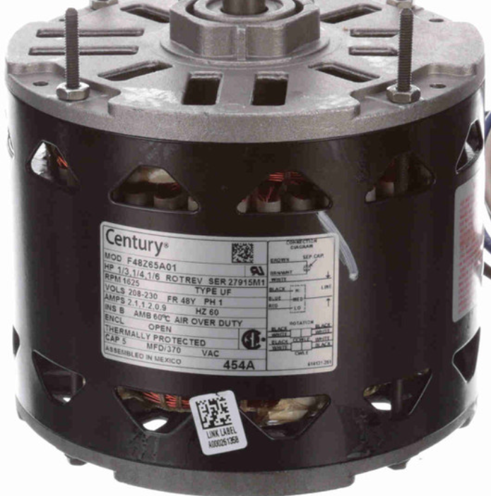 The Century 454A (F48Z65A01, 27915M1) Fan and Blower Motor is a premium PSC (Permanent Split Capacitor) motor designed for reliable performance in HVAC fan and blower applications. Delivering 1/3 HP at 1625 RPM, this 48 Frame, single-phase motor operates on 208?230 volts and features three adjustable speeds for efficient air handling. Built with a 5.6" diameter rolled steel housing, automatic thermal protection, and ball bearings, it ensures quiet operation, long life, and high efficiency. Ideal for use in residential and commercial air handling systems, this motor offers reversible rotation, extended studs for secure mounting, and a 1/2" x 5.48" shaft with flat for easy installation.