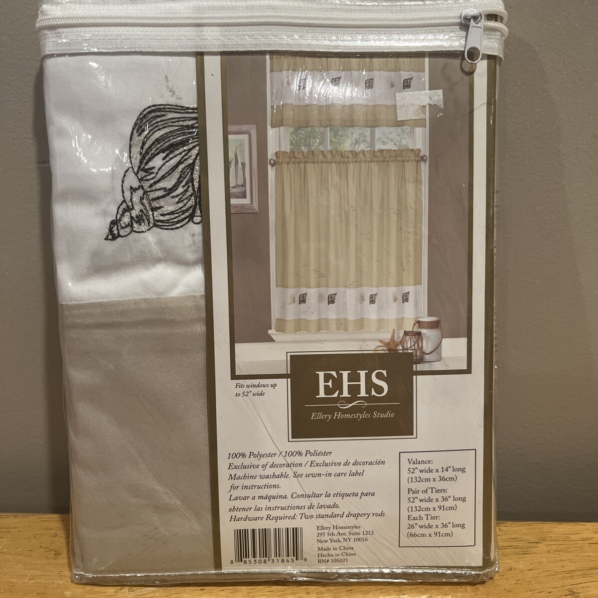 Enhance your home decor with the Ellery Homestyles 36 inch Tiers and Valance Curtain Set. The set features an embroidered pattern of seashells, giving it a coastal style that is perfect for any room. The rod pocket heading makes it easy to install and the machine washable material ensures easy maintenance.