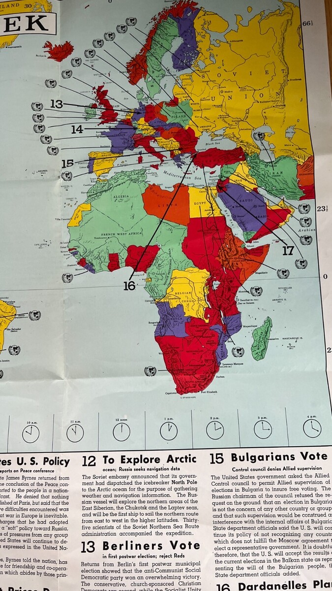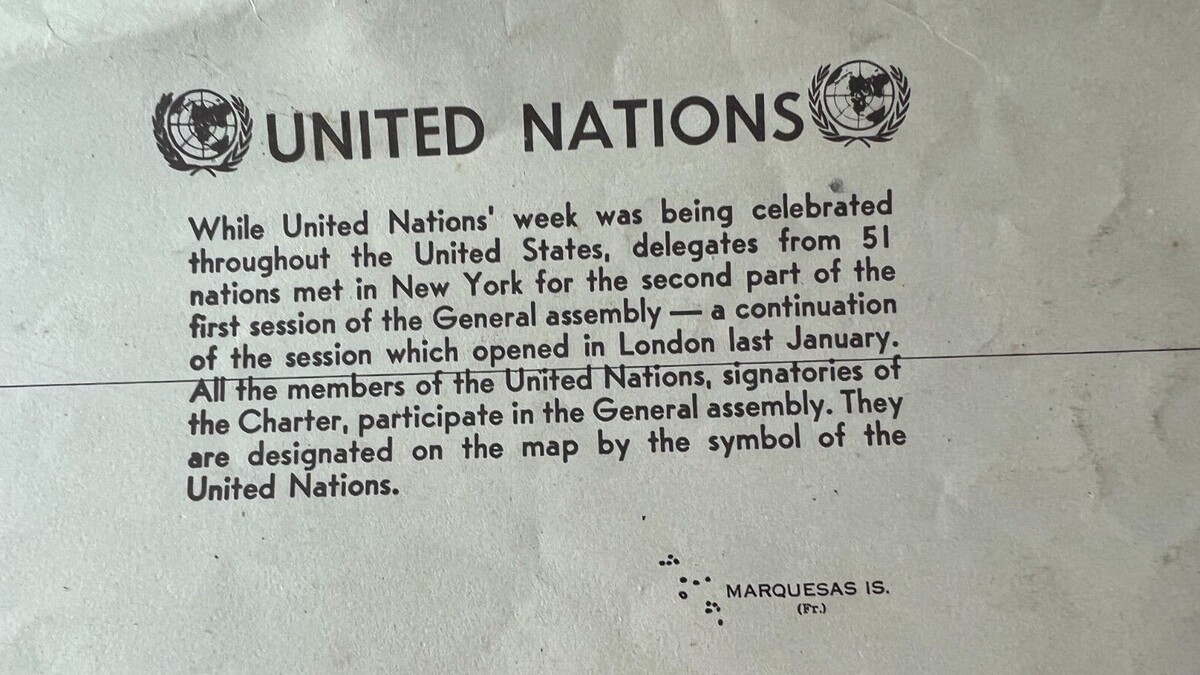 1946 United Nations World News Map Colorful 35"x 47" Vintage TWA Strike + More