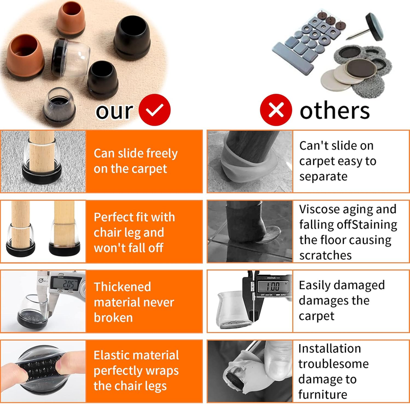 High Elasticity, Not Fall Off - Thermo - plastic - elastic body makes the product high elastic. Just slip over your chair than they'll stretch to the right size locks chair, table, stool, furniture legs tightly, and not easy to fall off. Our chair glides for carpet is thickened sliders bottom wrapped ( up to 0.4?/10mm ), make the wear and tear much more durable, lasting much longer, also waterproof, washable and reuse eco - friendly.