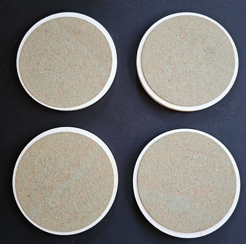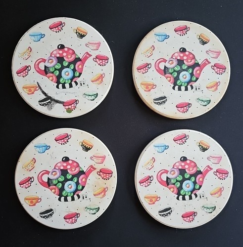 UP FOR SALE: Mary Engelbreit Teapot Design Set of 4 Round Cork Backed Stone Coasters Vintage
