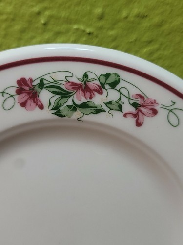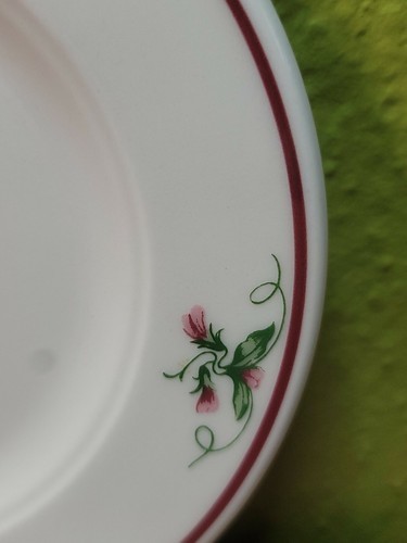 This is a more scarce pattern than the other pink violet patterns due to the burgundy ring around the rim.