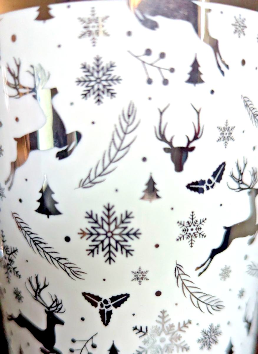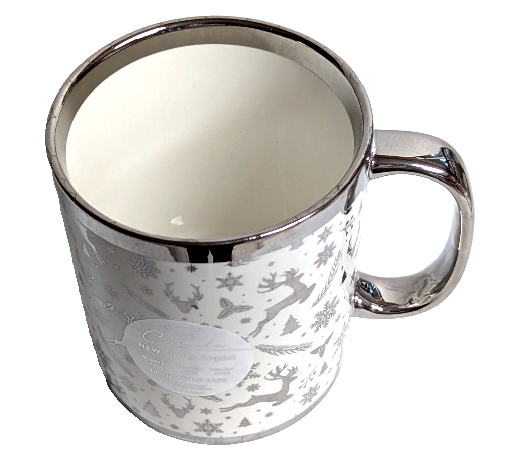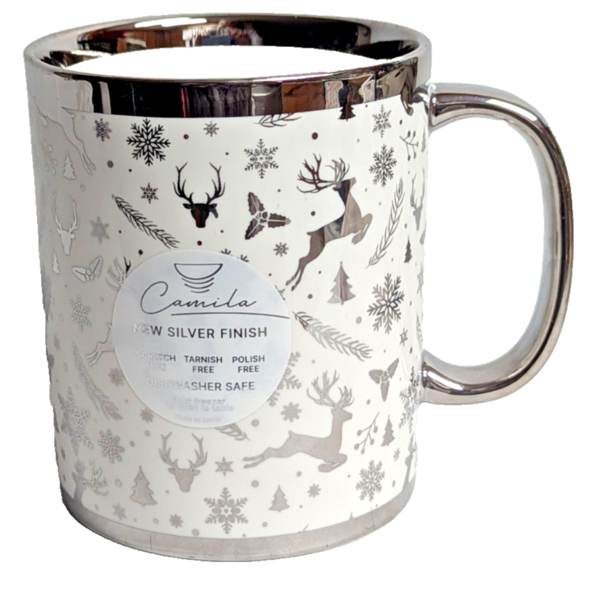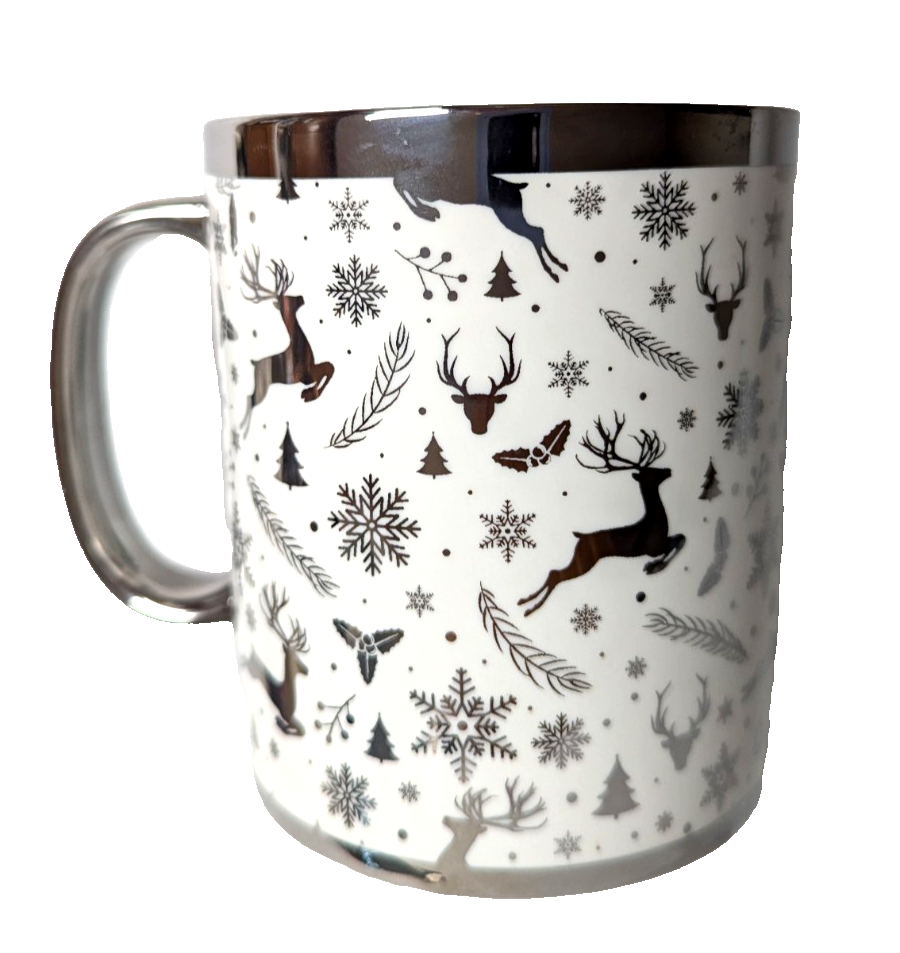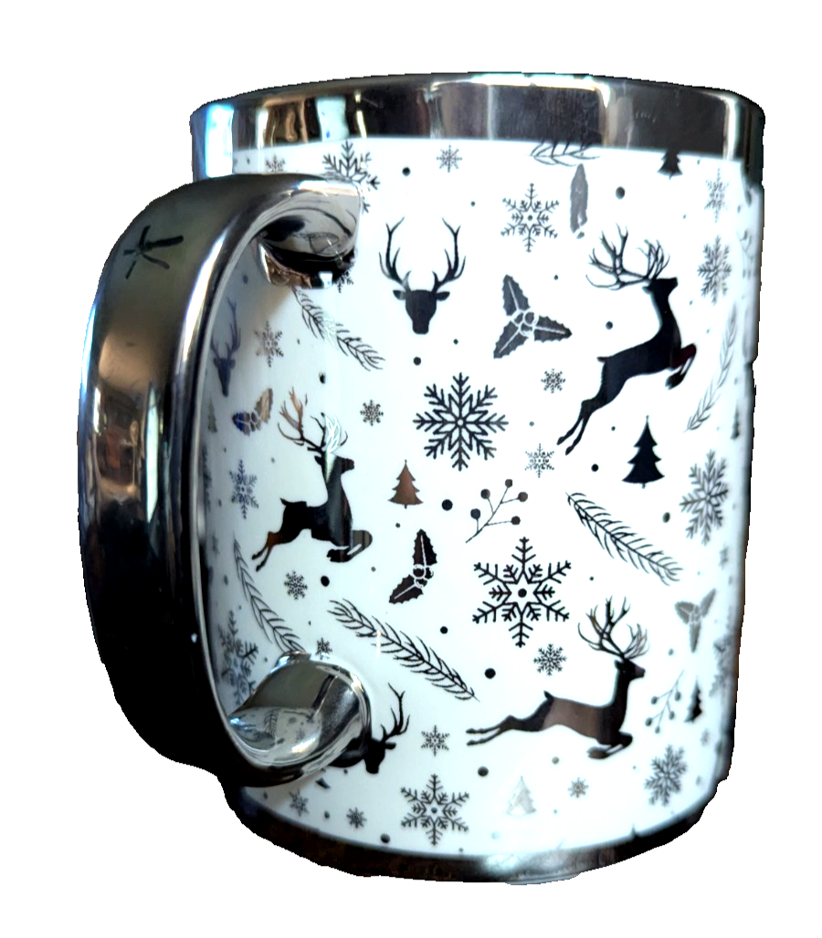 Camila Christmas Reindeer Coffee Mug Snowflake White Polish Free Silver Finish