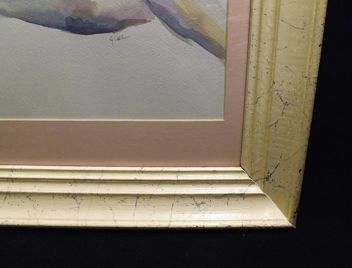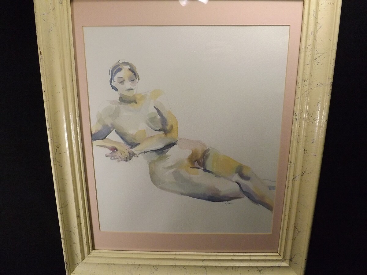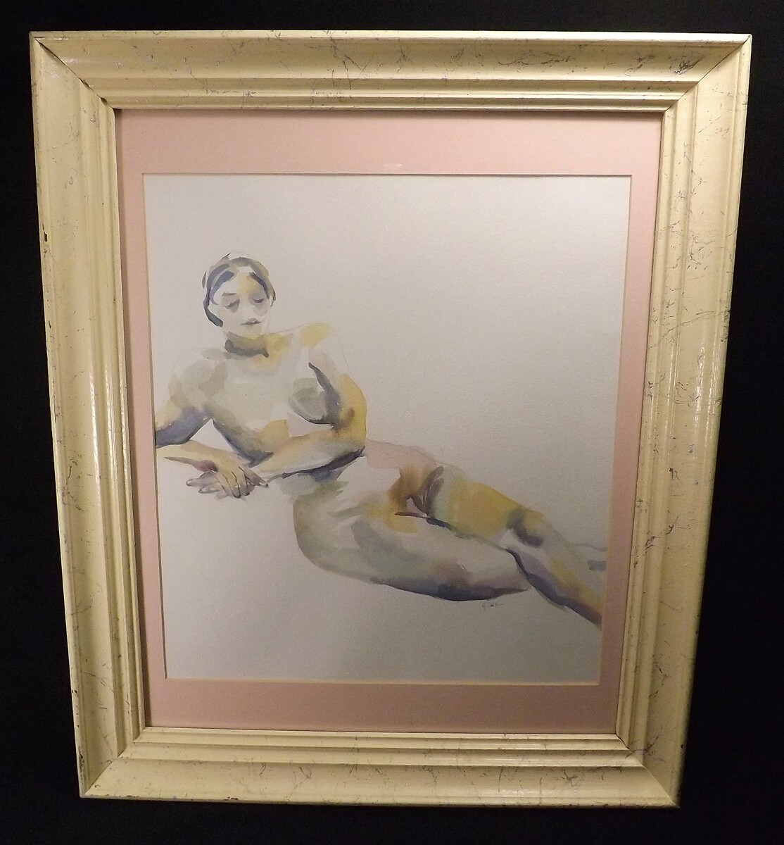 For your consideration is this vintage Signed Hand Painted Watercolor on Board of a Reclining Nude Woman in the Impressionist Style. The beautifully painted piece is housed under glass in its original mid-century hand painted and decorated wood frame. The painting is very well done and the piece is signed by the artist in the lower right corner and looks to be either J. Cole or J. Call (see images). The painting and frame are both in beautiful condition with the painting having no rips, tears, repairs or areas of concern while the frame has no damaged areas or areas of concern with minimal vintage wear or scratching to the finish. The piece measures 19 1/4" wide by 23 1/2" tall and is 1 3/4" deep framed. An exceptionally well done piece in a lovely painted and decorated wood frame sure to add beauty to your space! This is one of two paintings by the same artist in matching frames we will be offering so please visit our other listings!