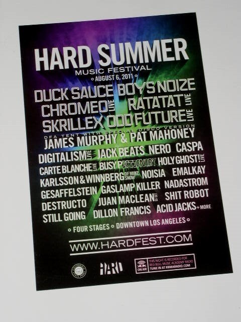 This is a 4" X 6" promo concert paper ad for the Hard Summer Music Festival August 6, 2011. Acts listed on the back: Duck Sauce, Boysnoize, Chromeo, Ratatat, Skrillex, Oddfuture. A terrific item for the fan or collector.