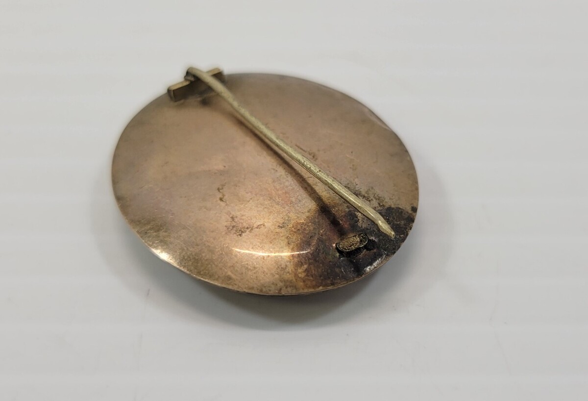 Pin is in vintage condition with some signs of age including some tarnish, marks, scratches and slight dings to the metal. The pin is still intact although a bit wavy. Glass is not chipped or cracked.