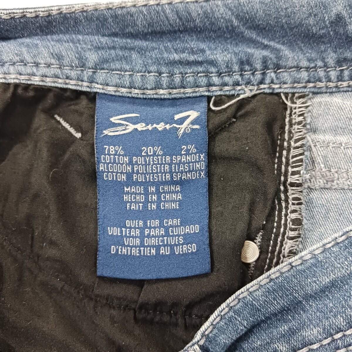 These Seven7 RN#109890 Women's Blue Cotton Blend Bootcut Jeans in size 10 feature a classic solid pattern with a zip and button closure. Made from a comfortable cotton blend material including polyester and spandex, these jeans have a mid-rise waist and a bootcut style. The 31.5-inch inseam provides a flattering fit for any woman's wardrobe.