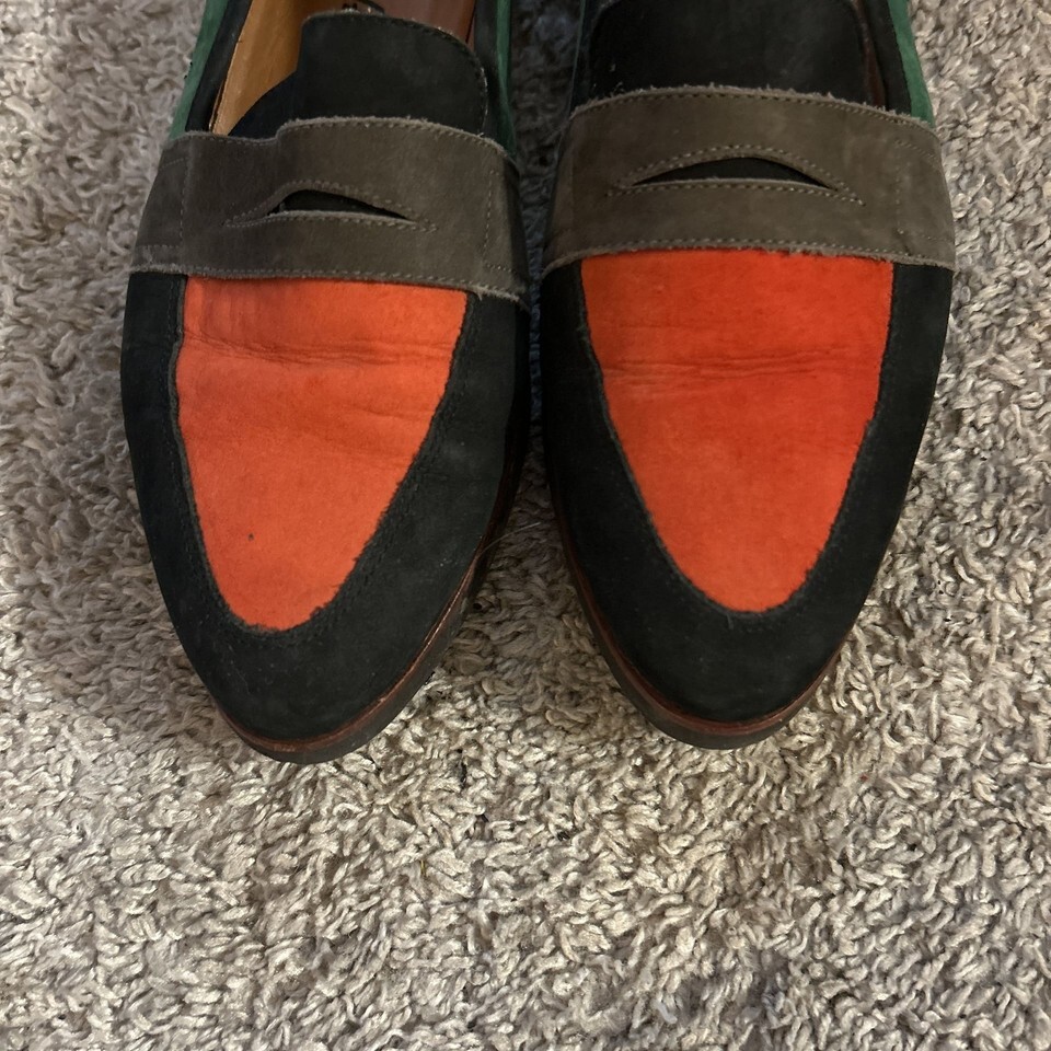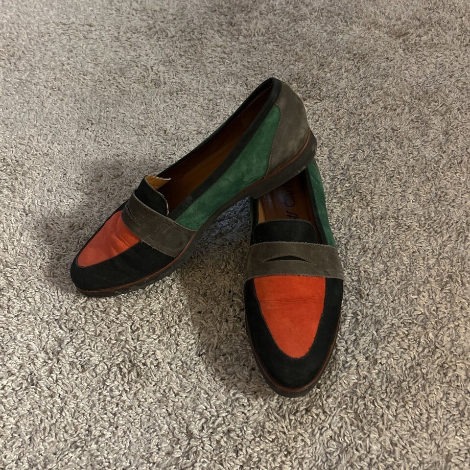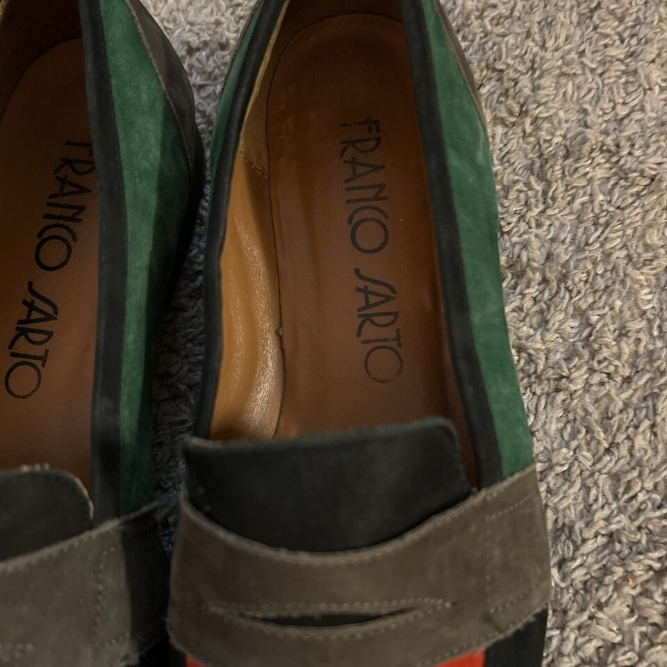 Elevate your style with these Franco Sarto Edith 2 Penny Loafers. These sophisticated shoes feature a classic penny loafer design crafted for comfort and elegance. Perfect for office wear or a chic casual look, these loafers are a versatile addition to any wardrobe. The images show a multicolored (green, black, orange, brown) design. In good condition, ready to wear.no tears or stains