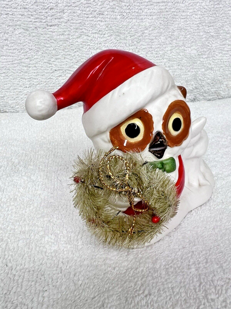 Vintage Napco Christmas Owl Candleholder in Santa Hat Fluffy Wreath Porcelain