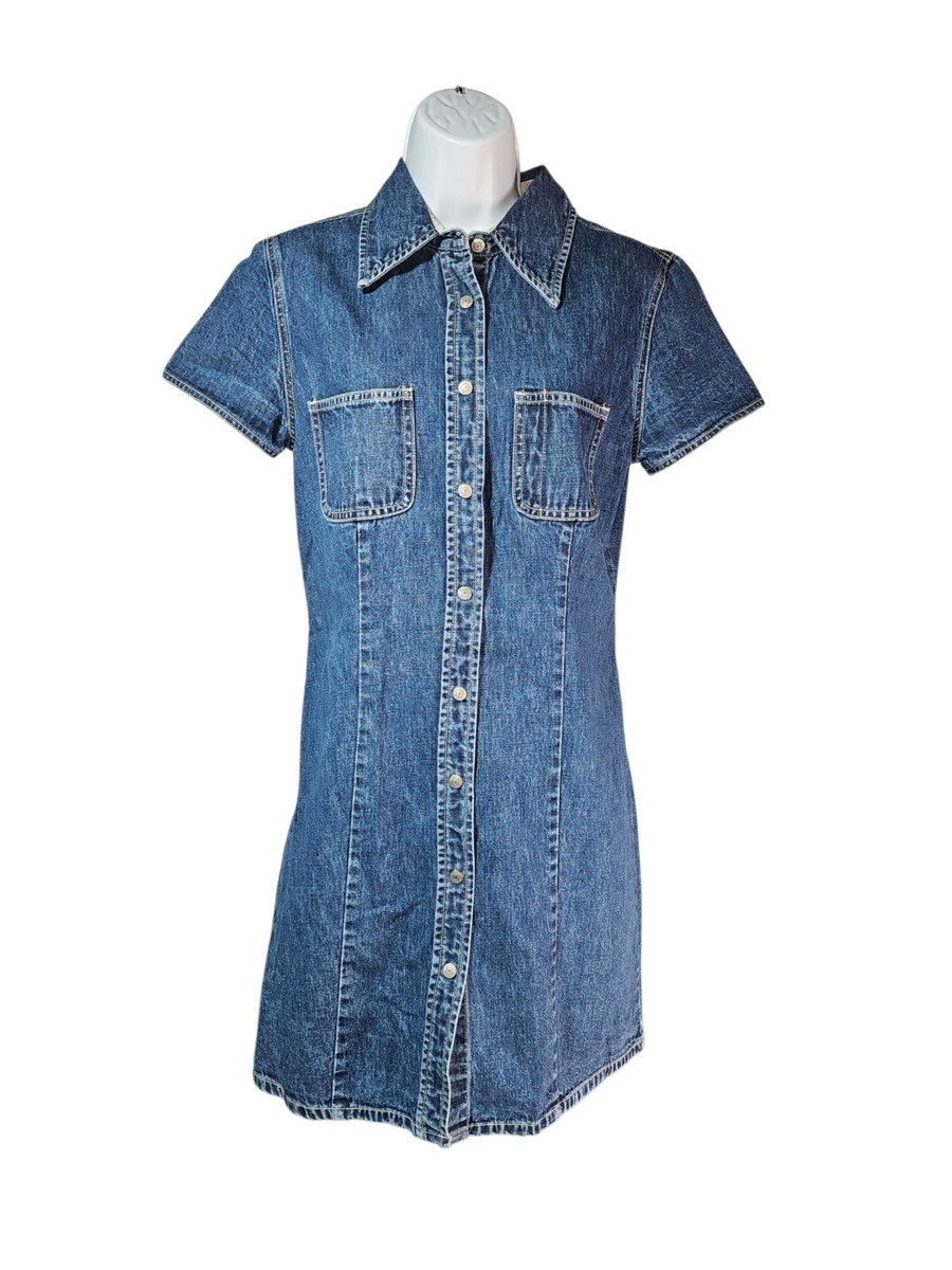 The product is a vintage 2001 Y2K Gap denim shirt dress in a women's size 8 with a snap-front closure. This cowgirl-inspired dress features a collared neckline, short sleeves, and a short dress length, making it perfect for casual occasions. Made of cotton denim in a solid blue color, this retro piece from the 90s brings a grunge-inspired style to any wardrobe. With its unique features like the snap closure and collared neckline, this dress is a versatile and stylish addition to any collection.