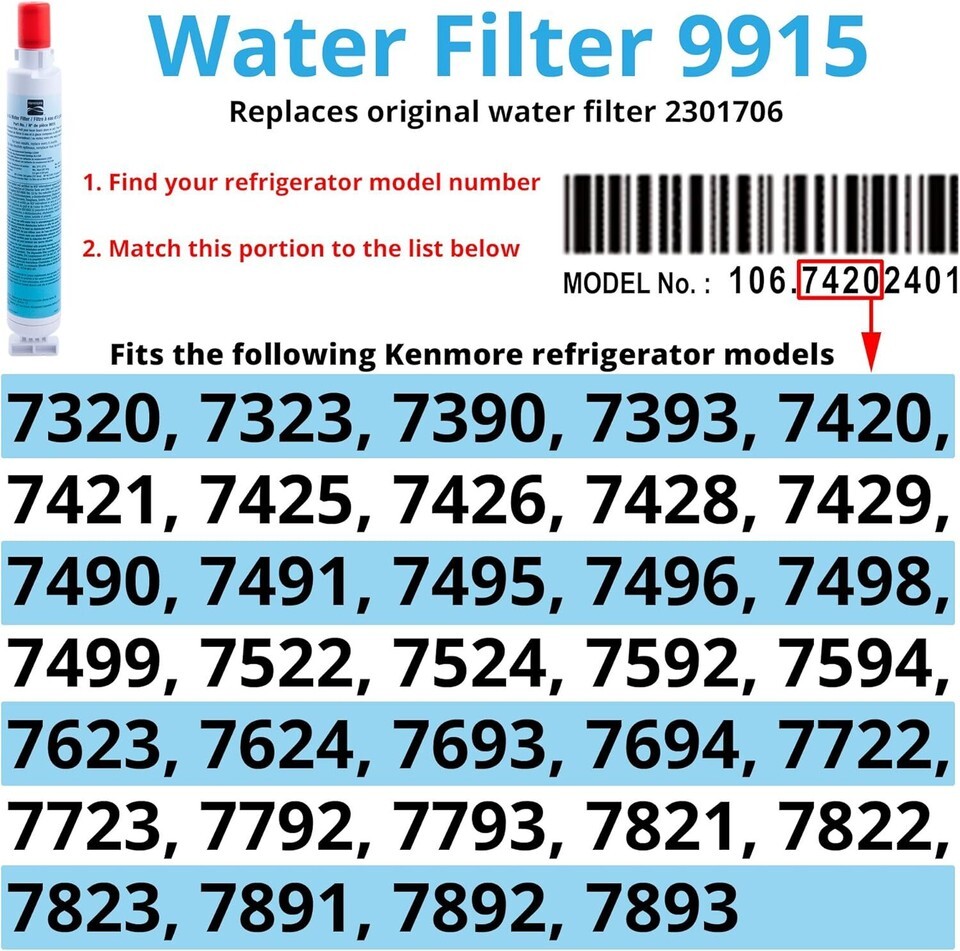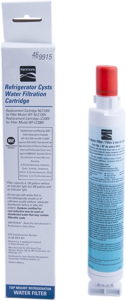 Kenmore water filter 9915 has NSF 42 and 53 certifications. It reduces chlorine taste and odor, cysts and lead. Water filter 9915 is for select Kenmore top-freezer refrigerators. Replace every 6 months, or more often if water flow slows noticeably. Follow package instructions when you install this genuine Kenmore water filter. Previous part number: 2301706.