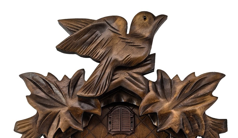 Design Aesthetics: Ornately carved with large leaf motifs framing the structure, topped by a detailed bird sculpture with outstretched wings. Below, a small chalet balcony showcases dancing figurines.