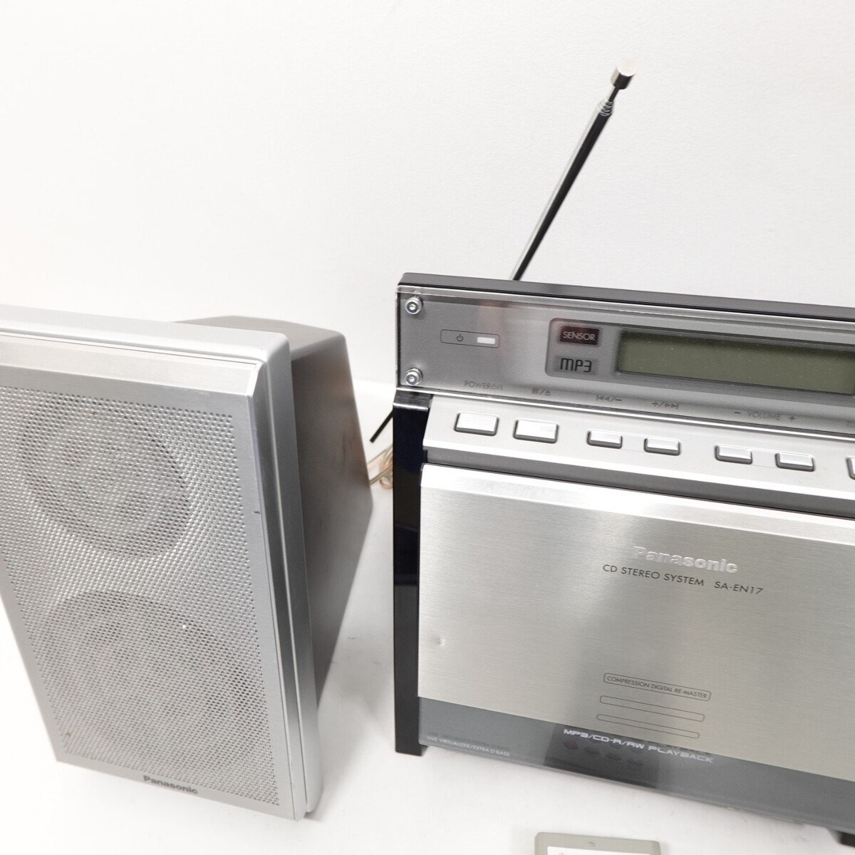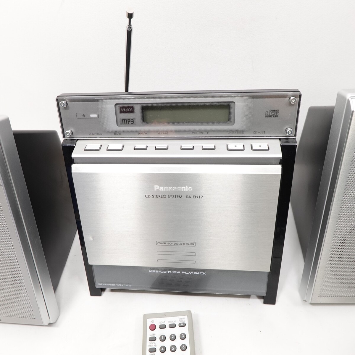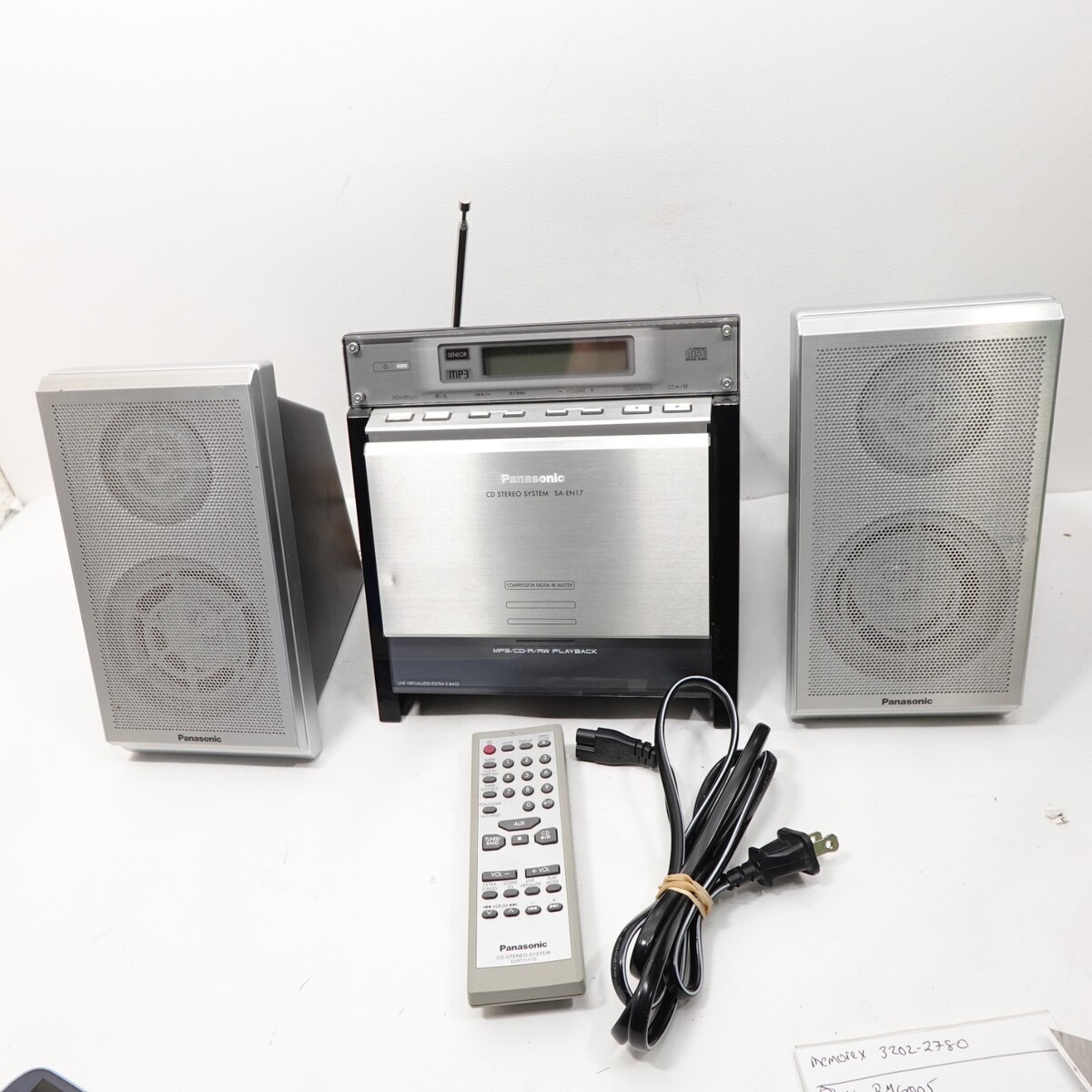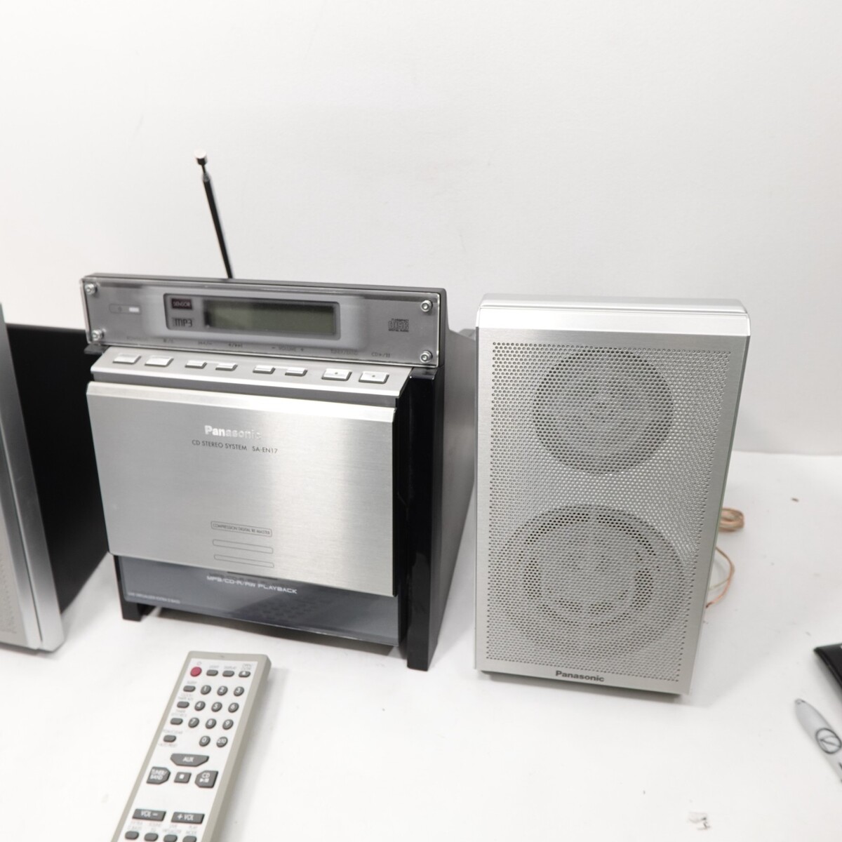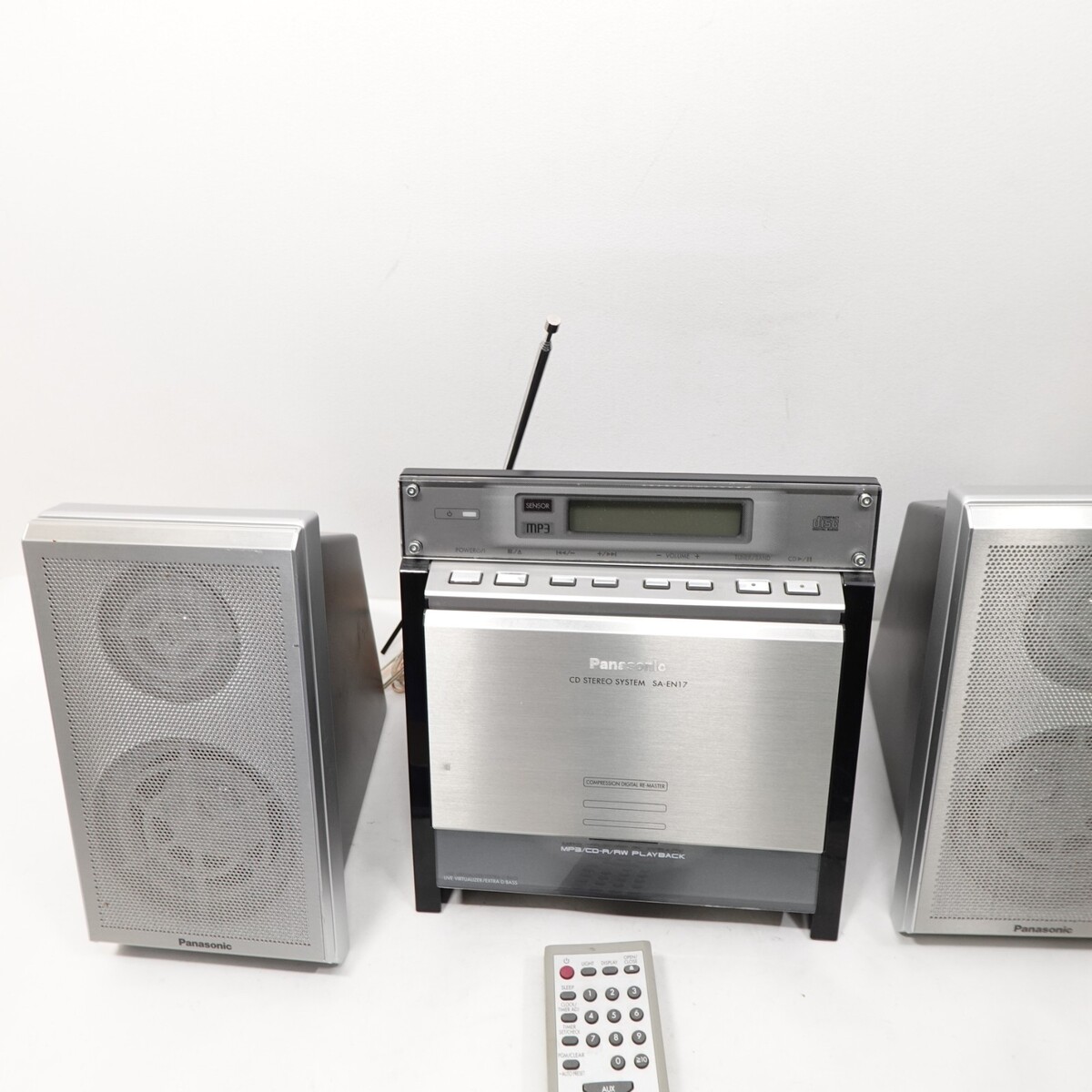 Panasonic CD Stereo System SA-EN17 complete with original speakers and remote. Fully tested ? everything works great including CD playback, AM/FM radio, speakers output, and controls. Clean sound, compact design, and modern brushed-aluminum look. Ready to use.