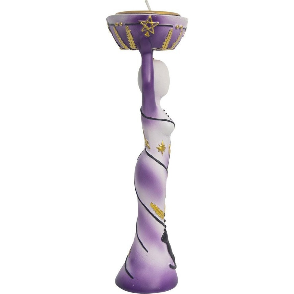 This polyresin Goddess tealight holder has been painted in purple and white, with gold accents of stars and moons. and a black cat at her feet. The bowl above her head features gold pentacles and accents. The tealight is included. Stands about 7 inches tall.
