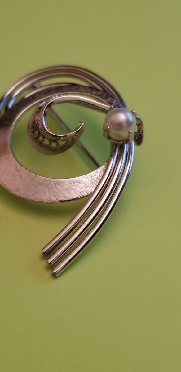 This elegant vintage sterling silver brooch features a bold modernist abstract design with sweeping circular arcs and a single faux pearl accent. Crafted in genuine sterling silver, this piece combines timeless sophistication with mid-century artistic flair.