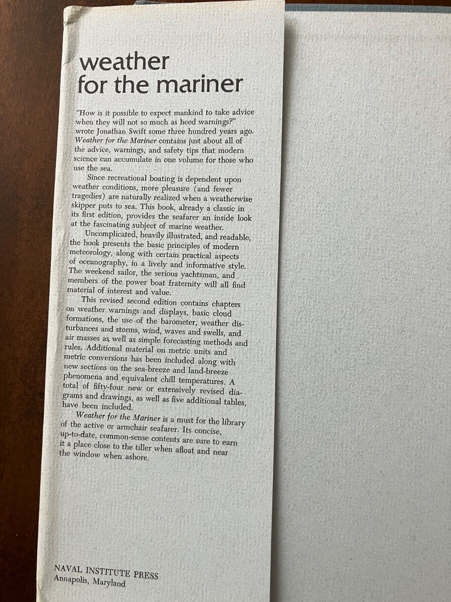Great educational book on looking for weather signs at sea and staying out of trouble. Talks warnings , forecast, cloud formations and more.