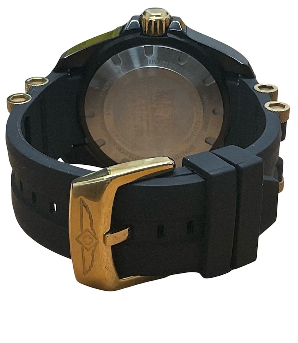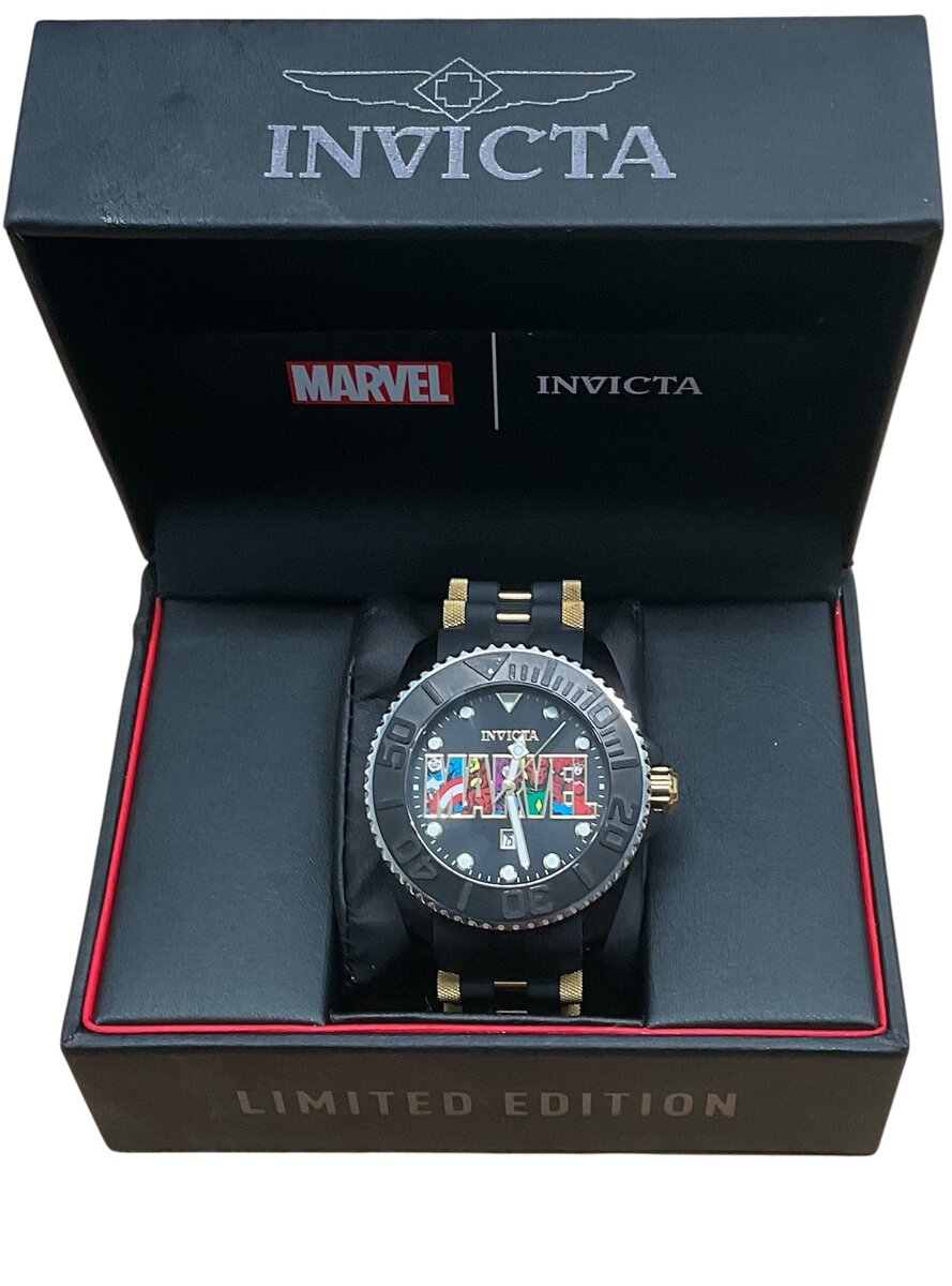 Type: Wrist watchBrand: InvictaModel number: 36415Model name: Marvel LogoCase width: 50mmWeight: 129.7Movement type: Quartz (Battery)Case Material: Stainless SteelBox included: yesPaperwork included: noRunning: yesDial color: Black/MultiBand material: RubberBezel Material: Stainless SteelCondition:UsedNotes:Limited Edition - 0291/4000