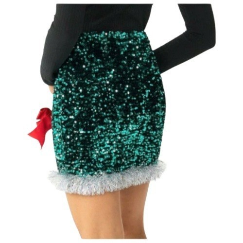 Sparkle in this green sequin mini skirt. It is decorated in a Christmas tree style. The skirt features green sequin embellishments, red bows, and yellow and red pom-poms. The silver tinsel trim along the bottom edge adds to the festive theme. Ideal for Xmas and holiday celebrations. Elasticized waistband. Skirt has stretch.