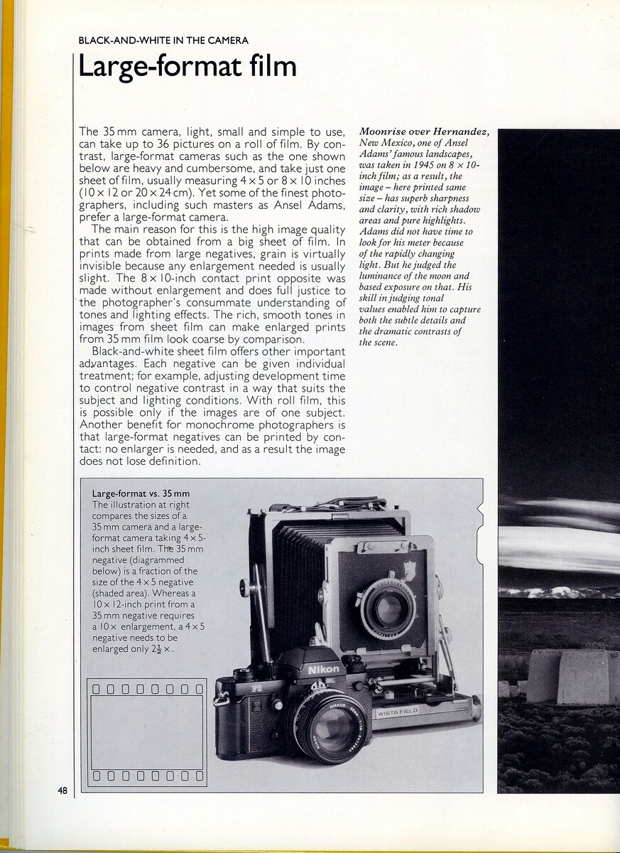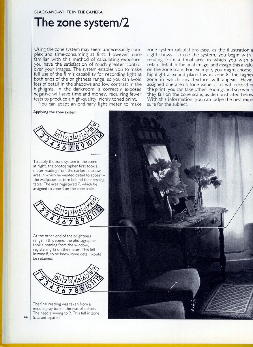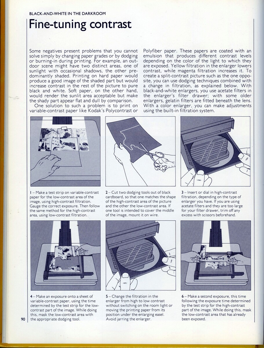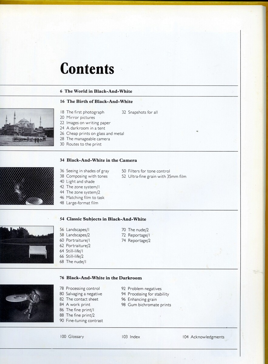Please read the contents page for a list of subjects covered in this book of black white photography, such as developing film, printing negatives, and the Zone System. Step-by-step instructions. This is a hardback book measuring 8 1/2" x 11" with 104 pages. There are no torn or dog-eared pages and no handwriting on any of the pages. The cover and all pages are clean and in good condition. (English).