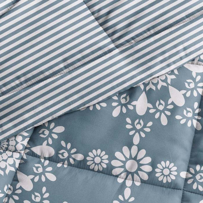 Transform your bedroom into a haven of comfort and style with the King Size 3-Piece Blue Reversible Striped Comforter Set from FastFurnishings, a brand trusted for its durable and innovative home essentials. This versatile set features a reversible design, allowing you to effortlessly switch between a sophisticated striped pattern and a vibrant floral medallion for a fresh look that complements any decor.