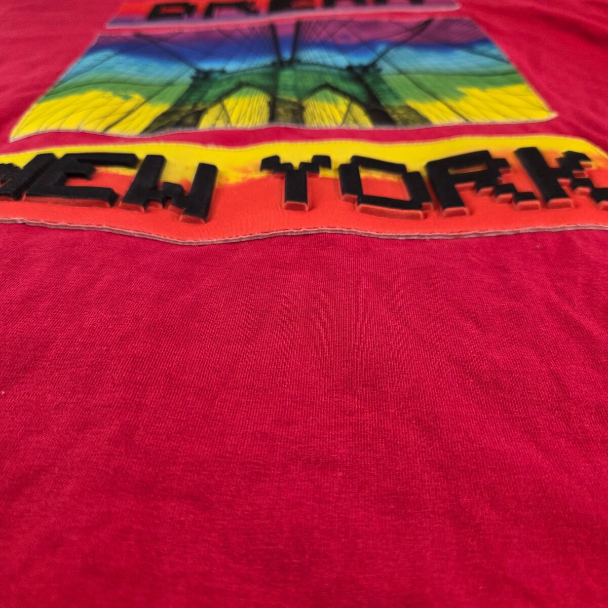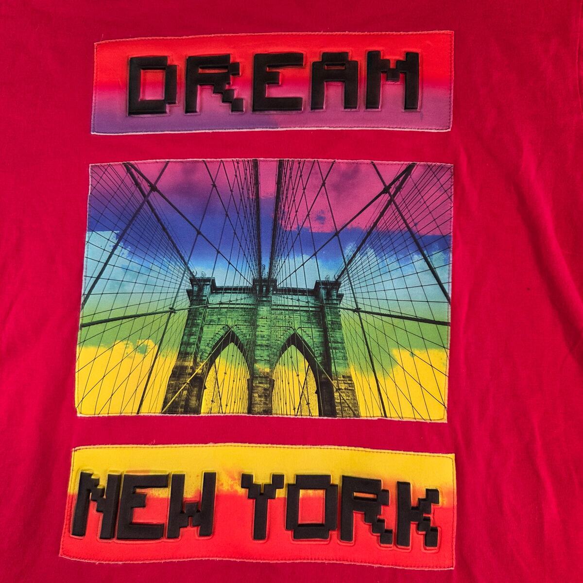 Design: ?Dream New York? raised lettering, rainbow cityscape graphic