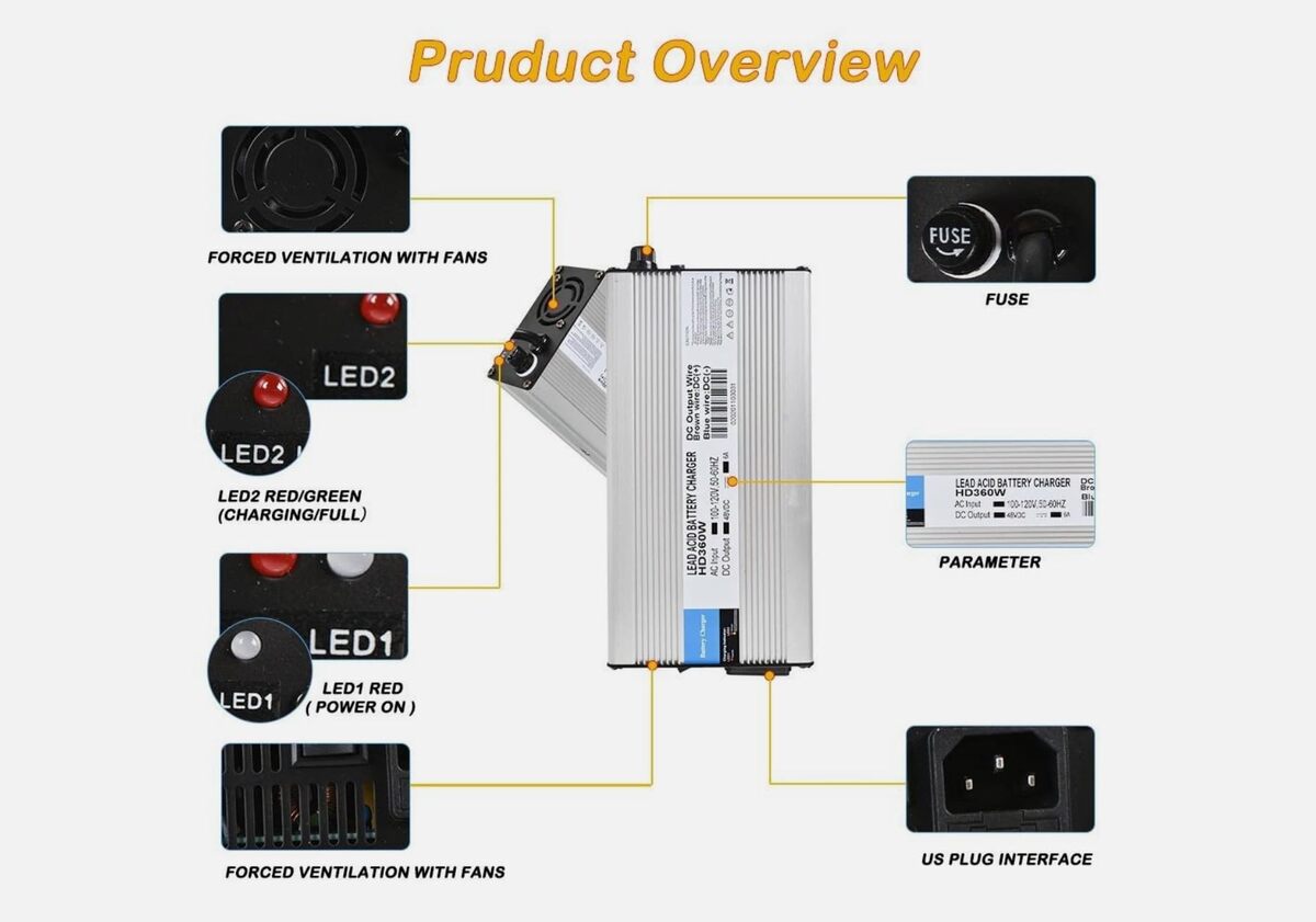 Input Voltage: 110-120v AC Output Voltage: 48v DC 6 Amps LED Status Lights Automatic 1New 48V Battery Charger 1x Standard 3 pin Connector Plug
